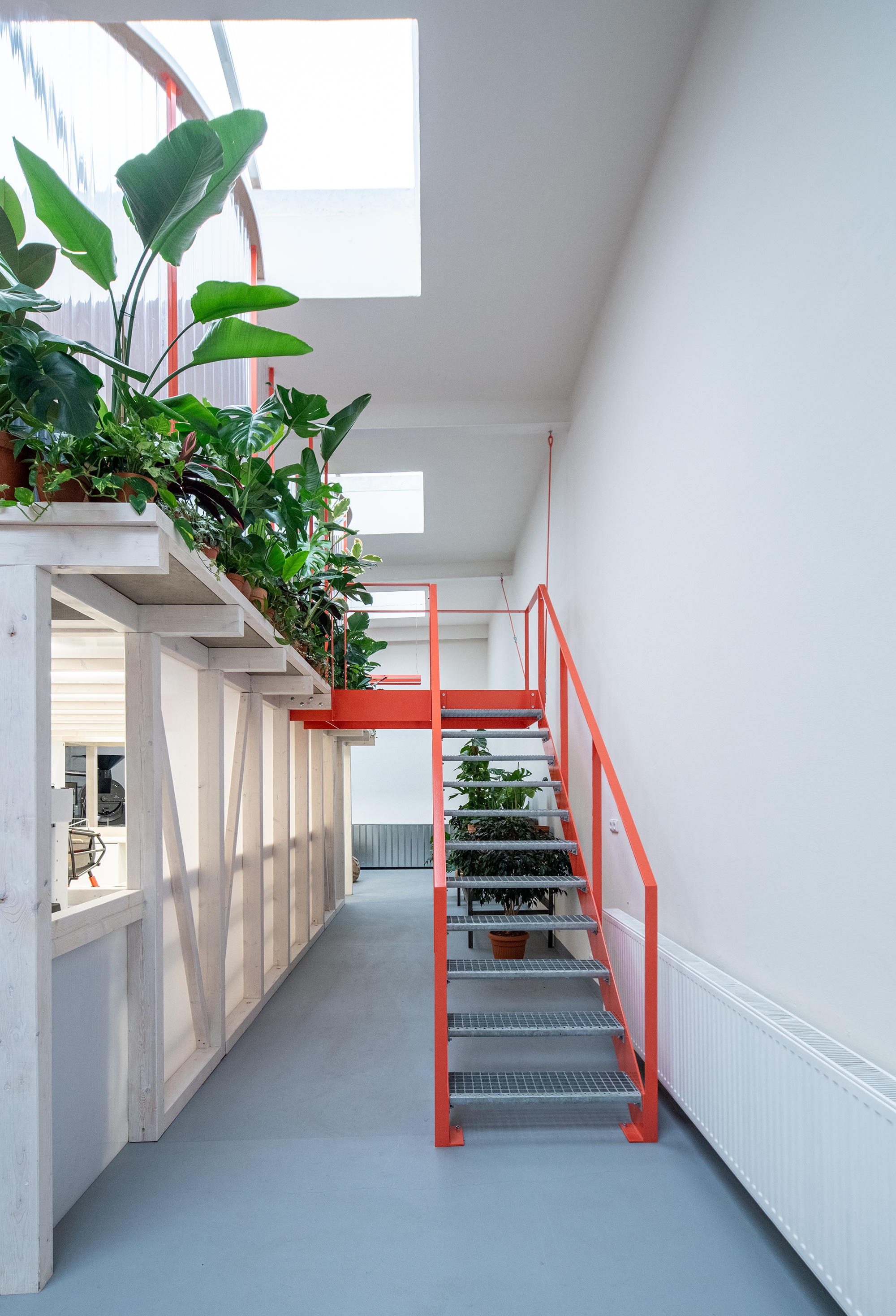 The further spaces from the entrance are dedicated to the in-house coffee production: from the storing of the raw beans to the roasting, cleaning, and packaging processes. The built-in inner room is made for the coffee testing, functioning both as the showroom of the professional barista machines and were educational workshops and competitions are taking place. The object’s front side towards the entrance is dedicated to the cafeteria and the sale of the coffee to the final users. Towards the sidewall, a suspended tangerine-colored metal staircase leads to the upper working space, enveloped by an organically shaped corrugated plastic wall. The organically designed plan allows nooks in which a variety of plants are growing and working as a source of natural air purifiers, dust collectors, and helping to keep a balance in the levels of humidity needed for the coffee processes.