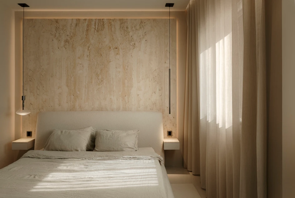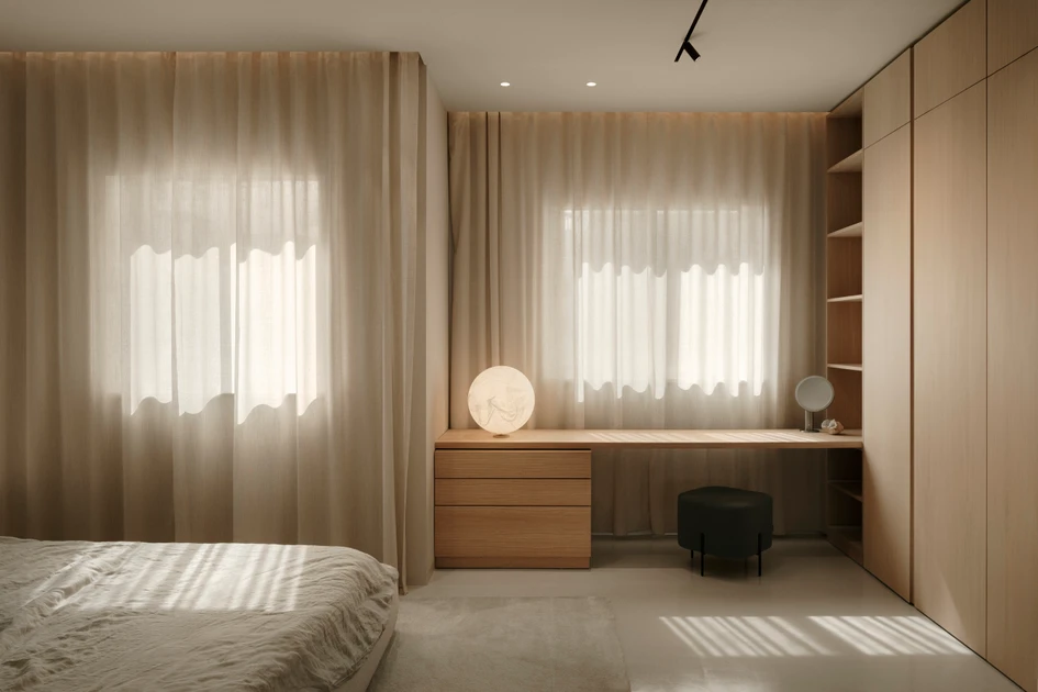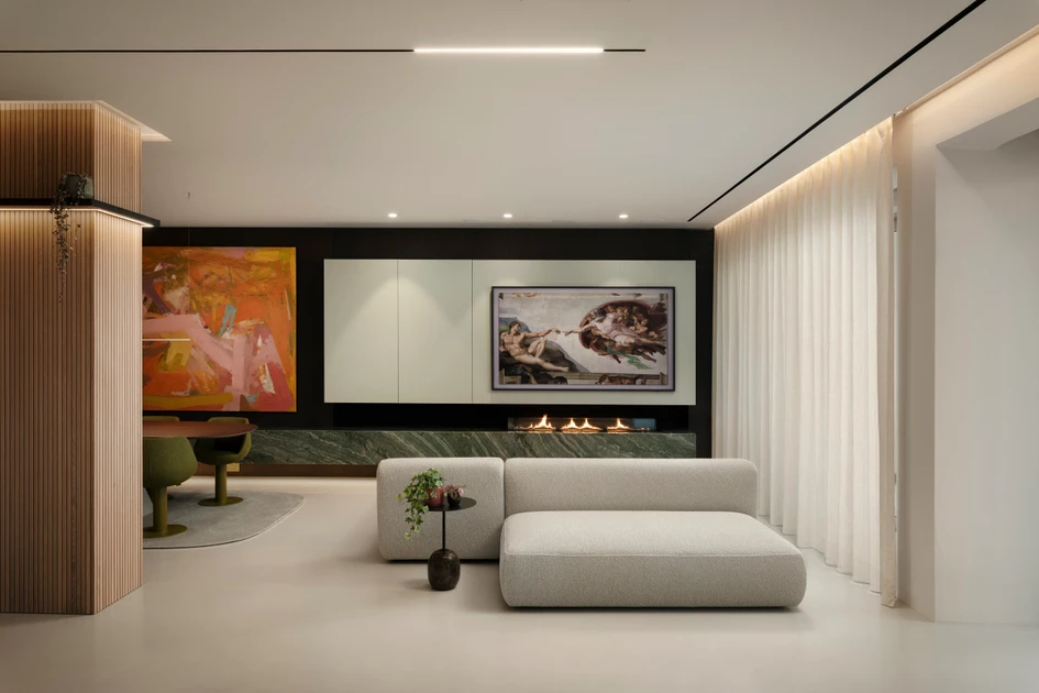 The project embraces both passive and active environmental strategies, enhancing energy efficiency and sustainability. Extensive use of natural light reduces reliance on artificial illumination, while the selection of durable, low-impact materials such as light oak joinery and travertine stone supports long-term sustainability. Thermal performance is prioritised through strategic orientation, optimising cross-ventilation to minimise mechanical cooling. Integrated greenery within shelving units enhances air quality and reinforces a biophilic connection, promoting well-being within the living environment.
