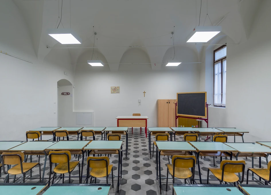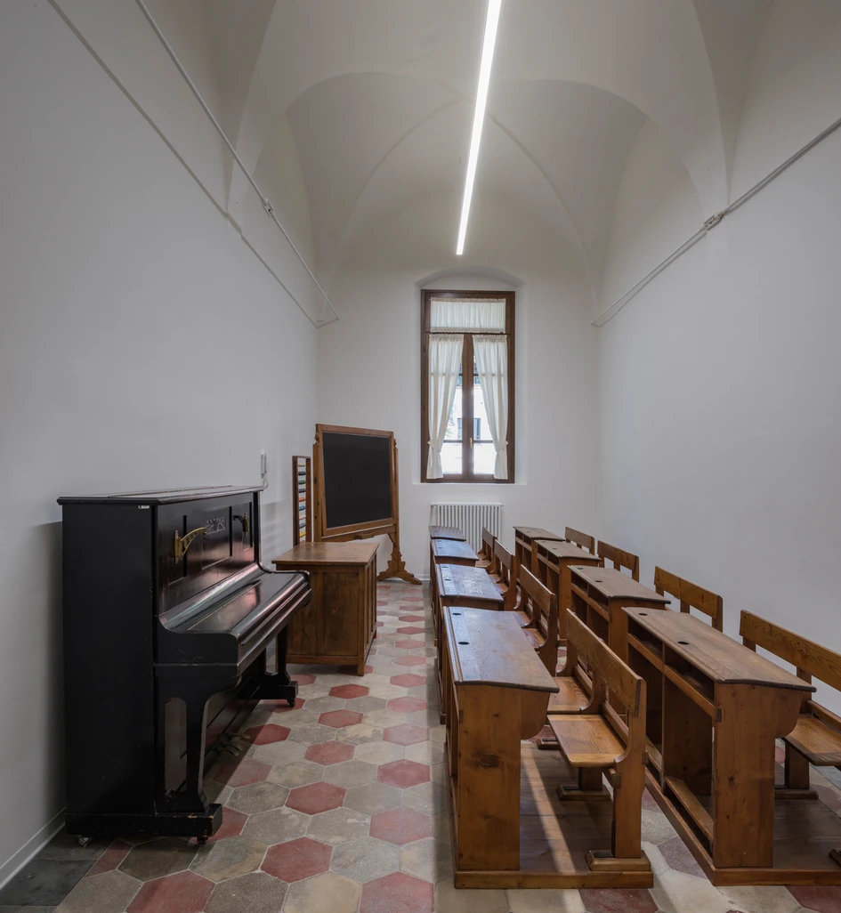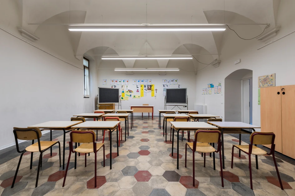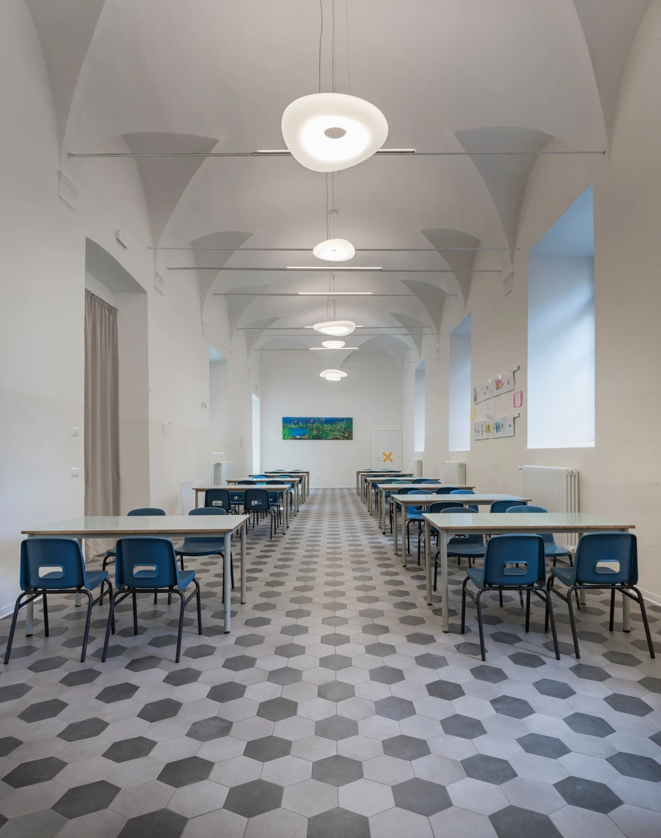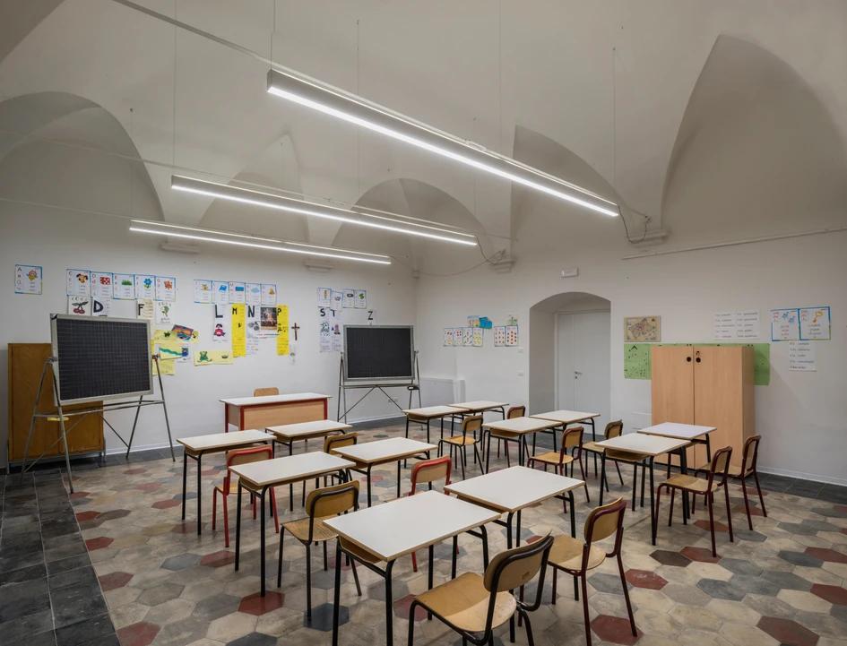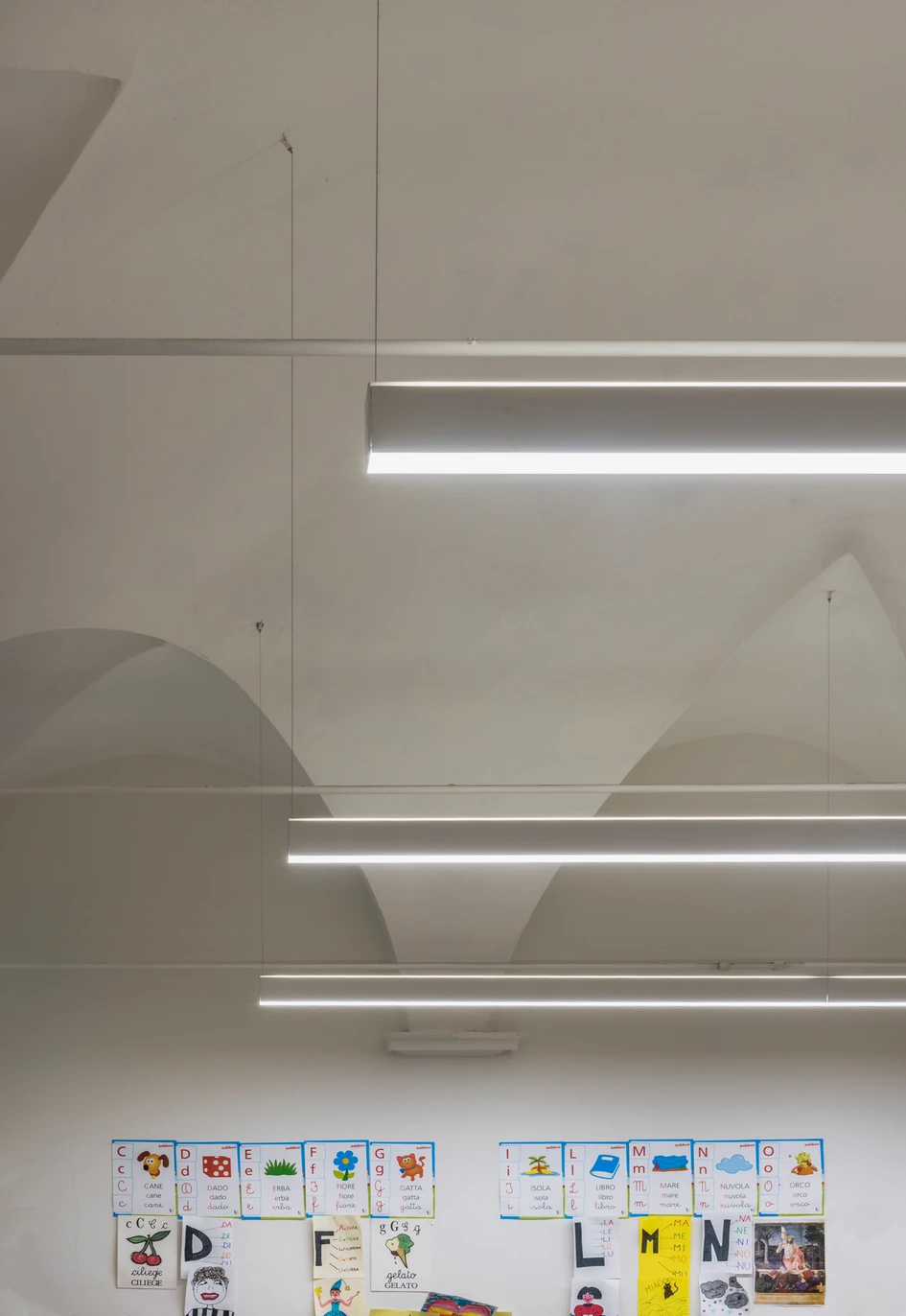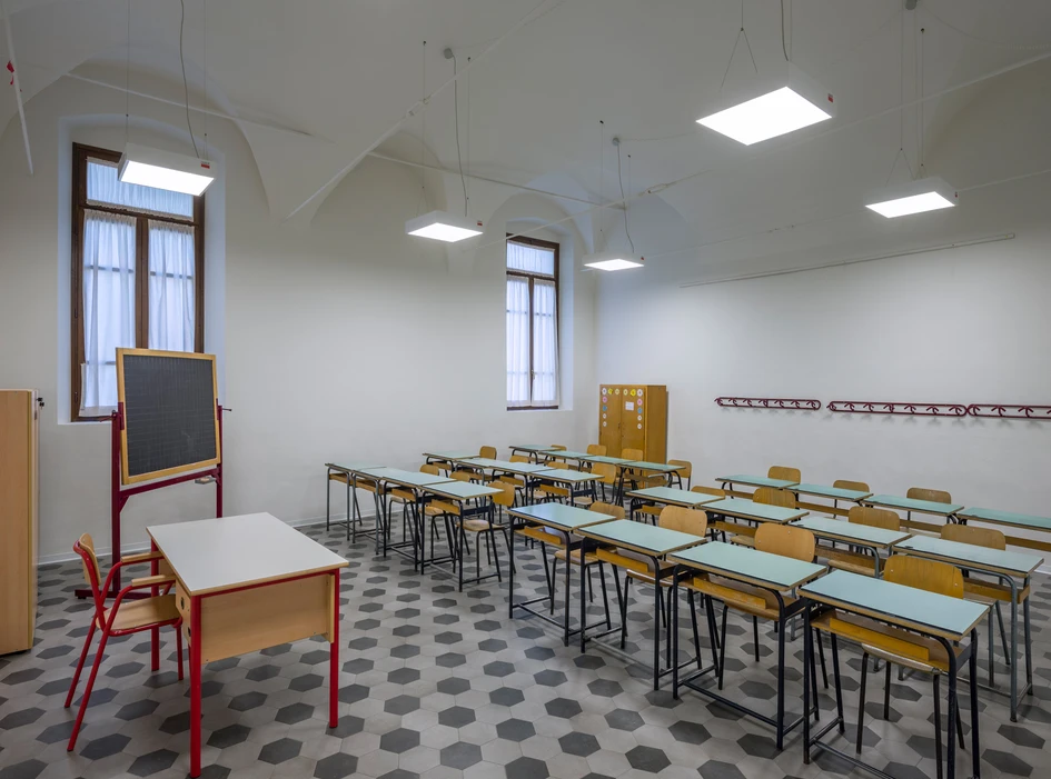 Der gesamte Komplex ist durch die Soprintendenza per i BAPPSAE (Landesdenkmalamt) zu einem “architektonisch und historisch bedeutsamen Gebäude” erklärt worden, weshalb neue Öffnungen für Fenster nicht zulässig sind. Somit war von besonderer Bedeutung, dass das Projekt bestimmte Normen einhält, sodass unter gänzlicher Beachtung der Augengesundheit des Schulpersonals und der Schüler eine für die Nutzung der Flächen geeignete Beleuchtung gewährleistet ist.