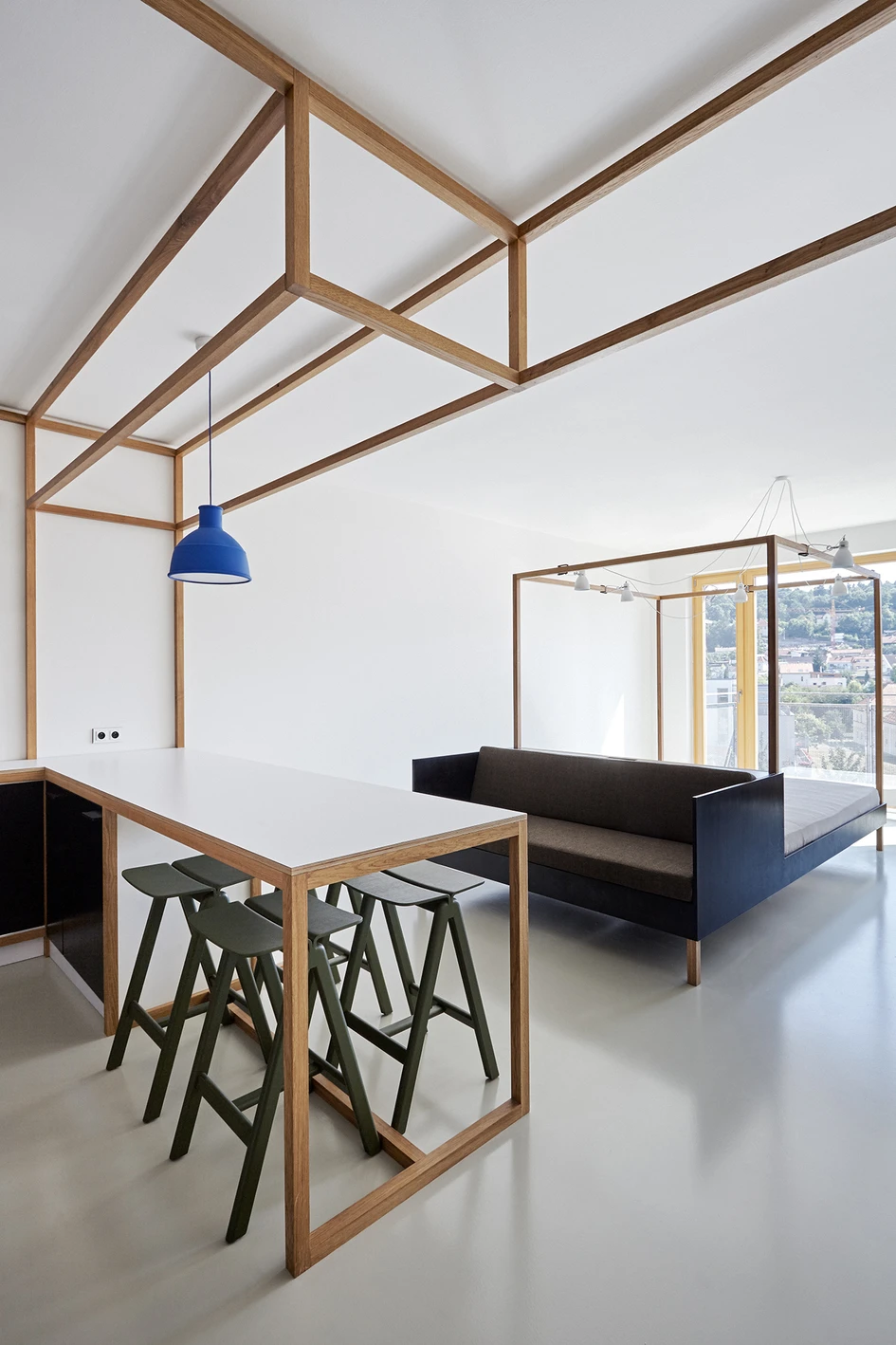Owner of spacious apartment in Prague, Vokovice decided to add a minor one on the same floor.We transferred single studio into the guest house for guests whose are visiting young international family from far far abroad and for longer periods of time. In general for family members and friends. It has a complete infrastructure to enable them to stay in touch without ever get the feeling that they are a nuisance. Separate kitchen with bar/dining table, on the contrary gives them sufficient facilities for the preparation of news from home cuisine and the opportunity to become the host for a moment.
