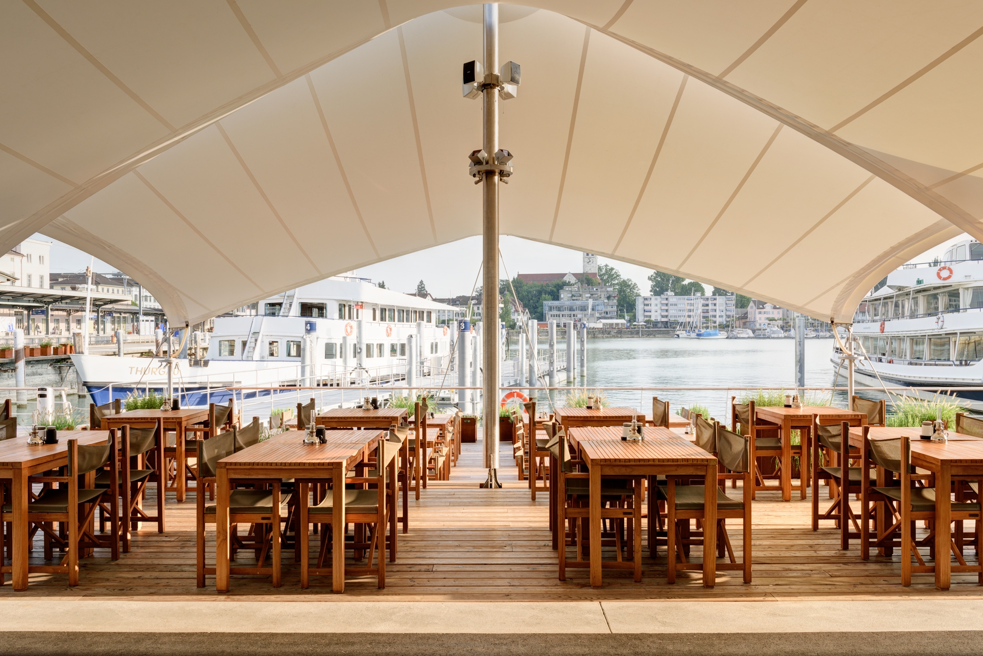 At the beginning of 2015, the Swiss lakeport town of Romanshorn and SBS, a Swiss corporate shipping line servicing Lake Constance, created a new, attractive urban space directly along the shoreline. Now a restaurant has been erected on a promenade built into the lake, a locale whose architecture is completely characterised by ships and the seafaring world.