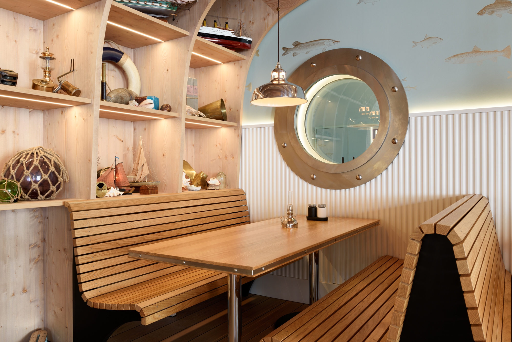 Keeping in mind that the broadly ranging target group consists of tourists, people in transit from the railway and ferry, families and local business folk, the restaurant has to fulfil the widest variety of needs on the smallest amount of space. An alcove with nostalgic benches, similar to those on the passenger boats that tour the lake, offers porthole views of the underwater landscape on the opposite wall area. At the table for ‘regulars’, patrons can communicate with the imaginary engine room via an original captain’s speaking pipe. A raised table with bar stools is optimal for a small lunch. Maximum flexibility is provided by the tables for two, which can be combined into larger and smaller table groupings.