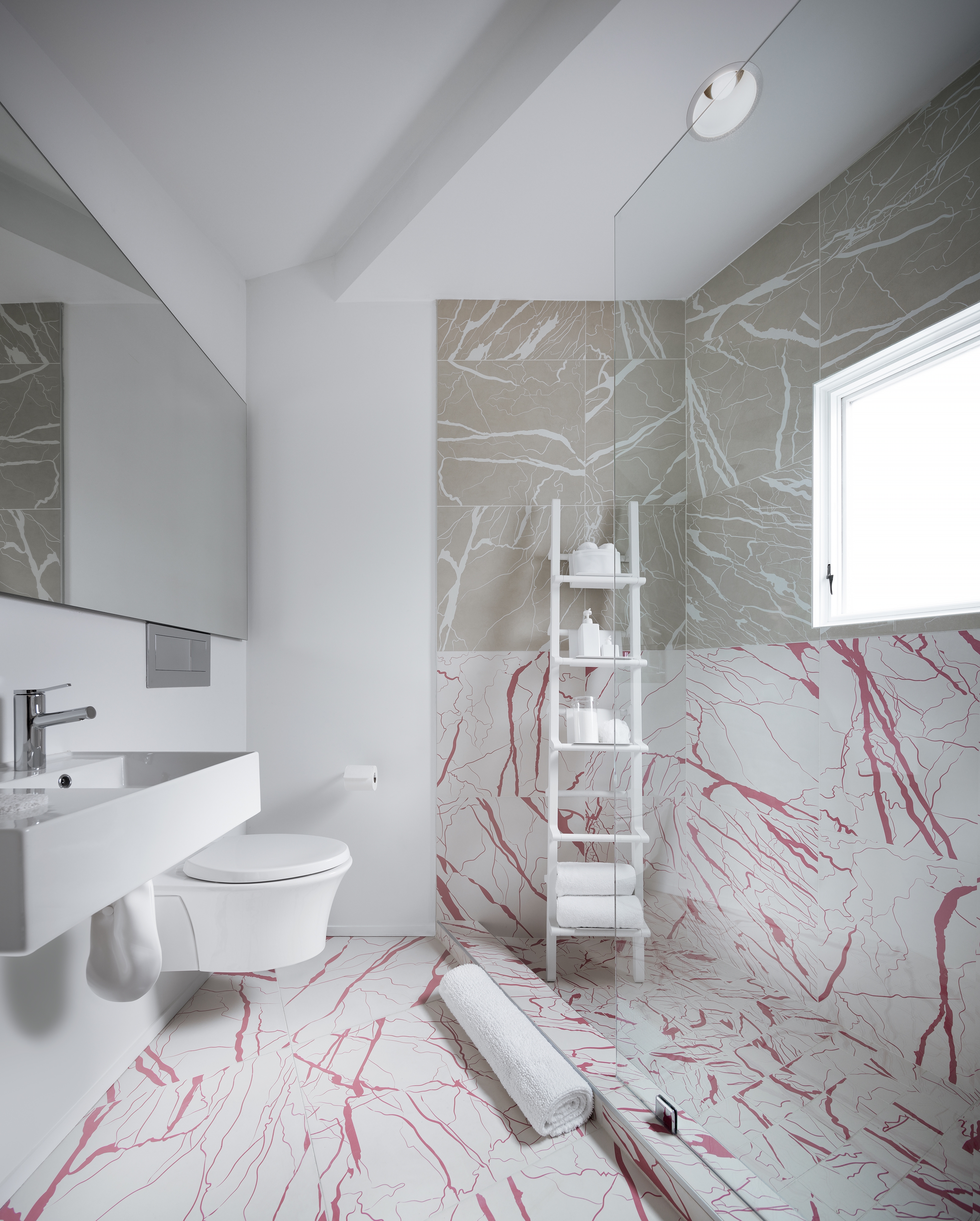 On the exterior, two sides of the house are covered in faux bricks made of stucco dash-finish of glass beads that produces a glittery effect. Inside, black terrazzo is not poured in-place and polished, but applied as a thin tile, while oriented strand board (OSB) is replaced by ceramic tiles in the image of OSB. Marble finishes in the bedroom and adjacent bathroom are made of unlikely materials, including vinyl and cartoonish drawings, rather than the oft desired, real Italian marble. Areas of grey concrete, yellow vinyl marble, and black terrazzo line some walls much like wainscoting, with several long views through the house allowing for a color-block effect. These faux finishes seem to indicate spatial divisions, when in reality they do not correspond to the actual boundaries of any room.