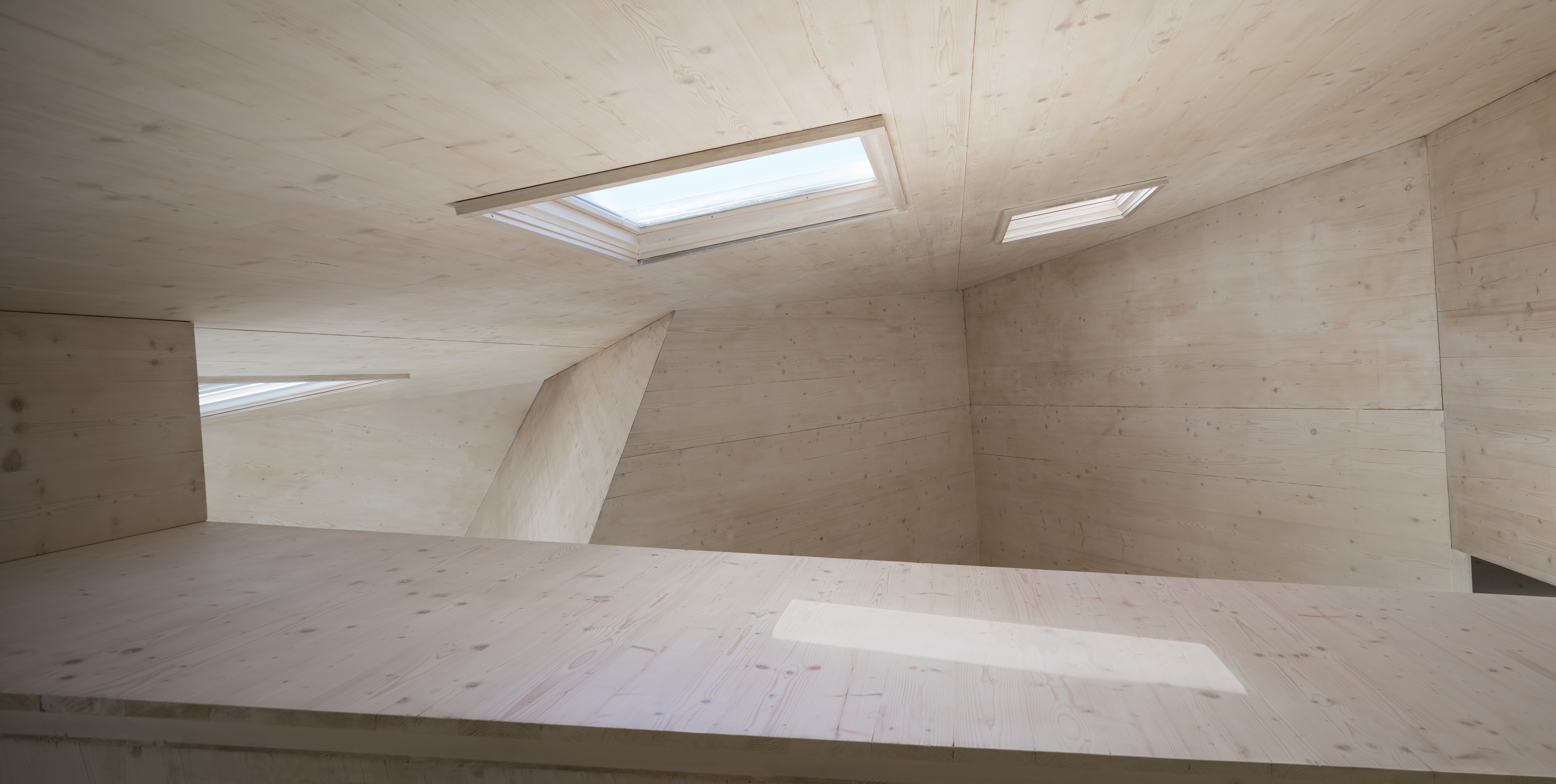 - Rooms, catwalks, and double height spaces in the interior are aligned to ridges and valleys in the roof above, such that the floorplan is a result of the roof
