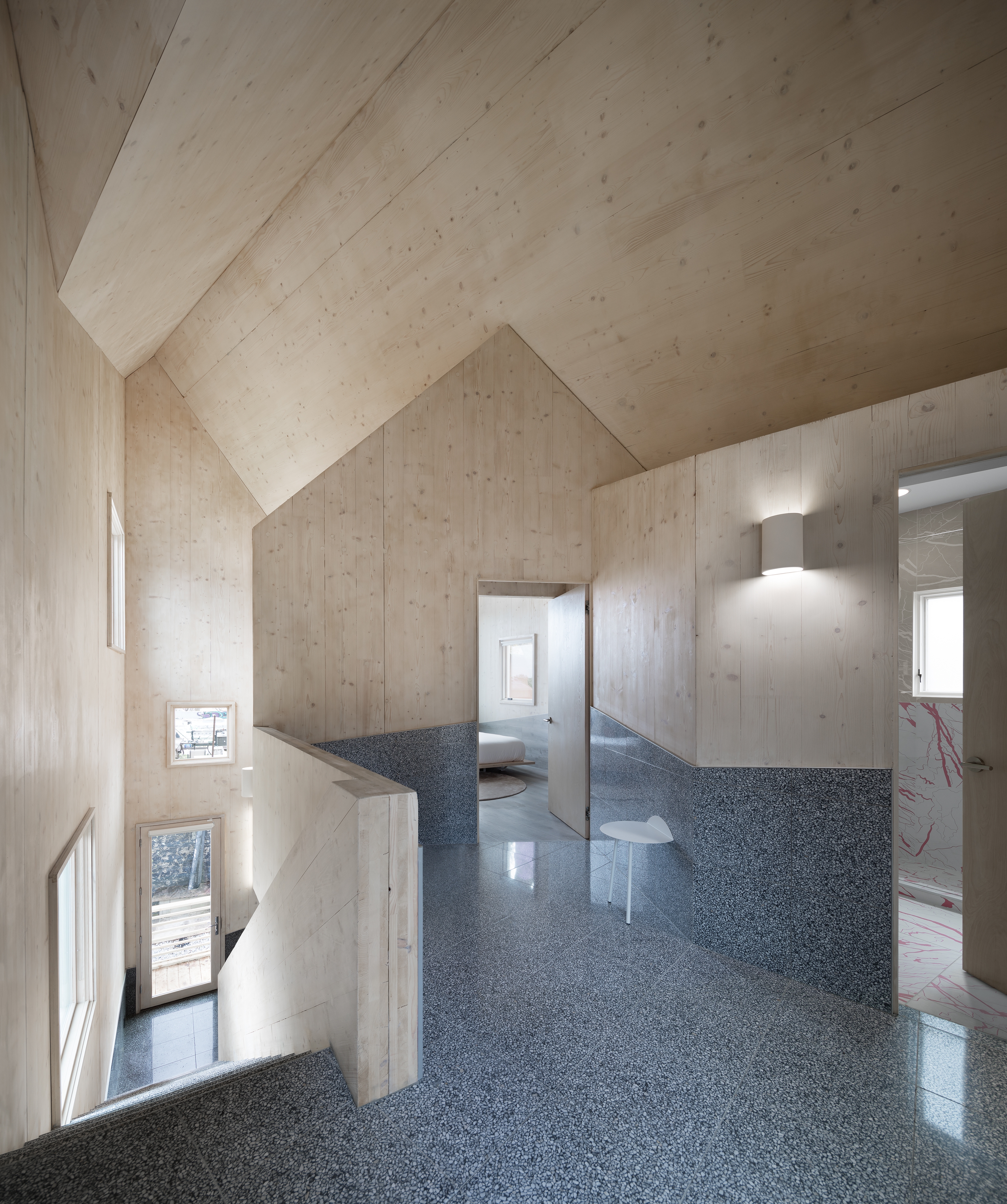 With the use of unconventional materials and an unusual roof design, Haus Gables is an exploration of new ways that spatial organization, form, and material might function in a home.