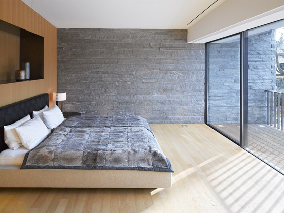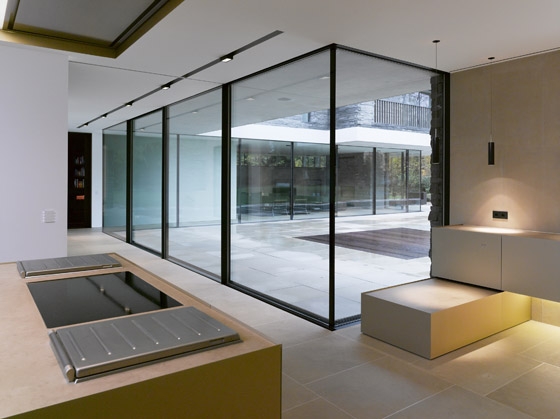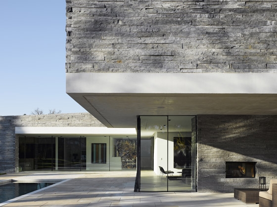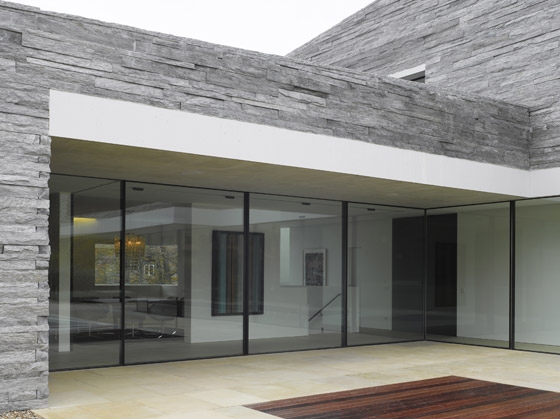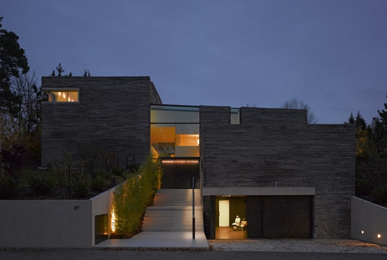 Die Besonderheit des Grundstücks liegt in seinem Nordhang, der über zwei Geschosse überwunden werden muss, um die annähernd plane Gartenebene zu erreichen. Daraus entsteht das Leitmotiv eines „sich den Hang hochwindenden Hauses“ mit einer Bruchsteinfassade, die im Zusammenspiel mit den ultrafeinen Fensterprofilen eine Dialektik „schwer-leicht“ thematisiert. Die Organisation des Hauses ist trotz der komplexen Geometrie in klar ablesbare Zonen eingeteilt, die zunächst auf additiven Grundmodulen von 7,80 auf 7,80 Metern basieren.