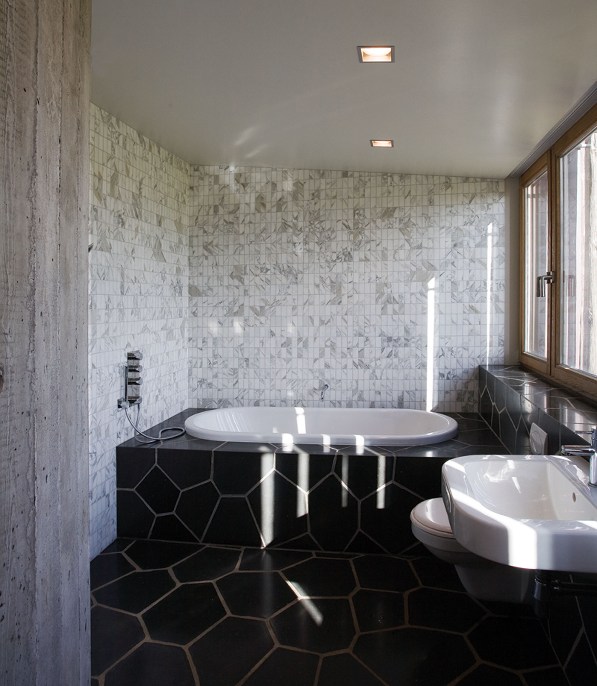Most internal walls are of raw or painted concrete and the ceilings, doors and other carpentry are predominately of oiled sawn oak with steel details; a rustic palette offset by smooth painted planes. In a gesture of refinement and escape the kitchen and bathrooms enjoy marble surfaces suggestive of more habitable latitudes whereas the larder’s glazed white tiles and basalt shelves reminds of the need to stash food for harsh winters.
