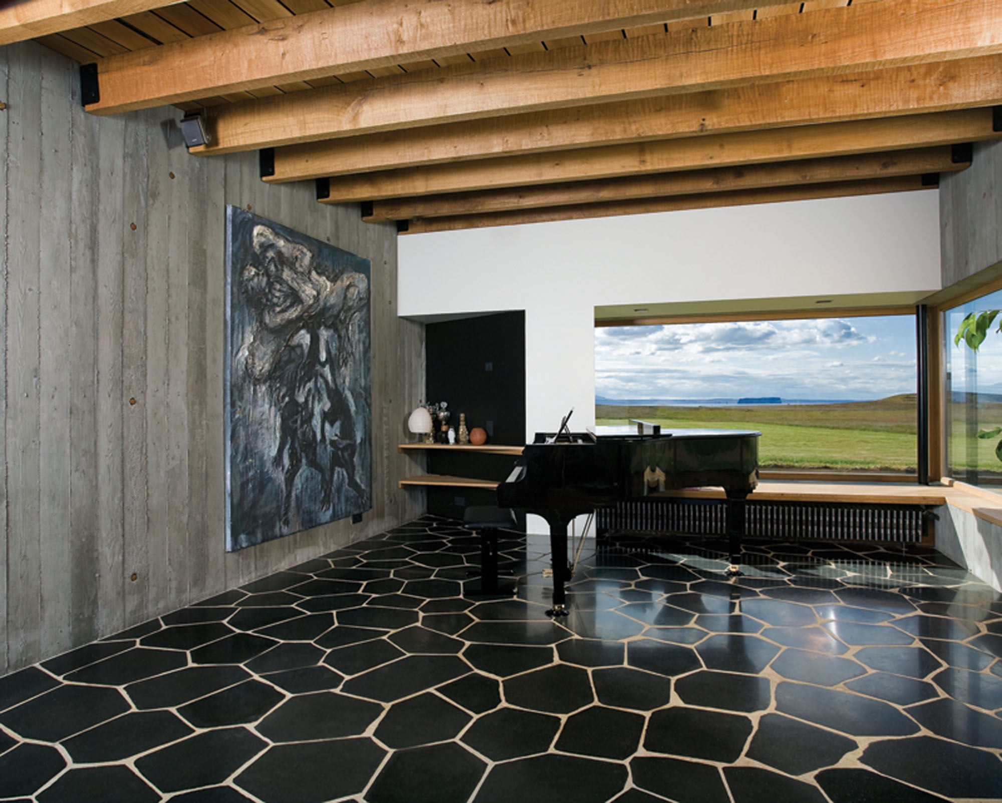 Externally the house rises from the tufted site as a series of sheer cedar and concrete walls that will weather according to the vagaries of the elements. The displaced grass of the field is reinstated on the roof and the surrounding meadow is cut and folded in earthworks of turf and stone that open ways to the entrance and terraces. Hexagonal basalt pillars were excavated from the site during the preparations for the foundations and the external surfaces are paved in this material. Internally the same stone is used throughout the living and circulation areas. Telegraph poles salvaged from the site were used as a sun/privacy screen to south-facing windows.