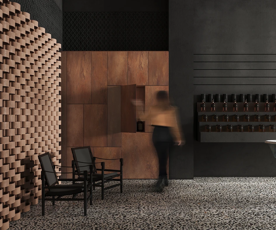 The studio approached this project as an exercise in "artistic expression" underpinned by the desire to create a unique space connected to the history of the city. Based on a nuanced palette of black tones and the predominance of concrete surfaces, the store is a good example of minimalist design and conceptual rigor.