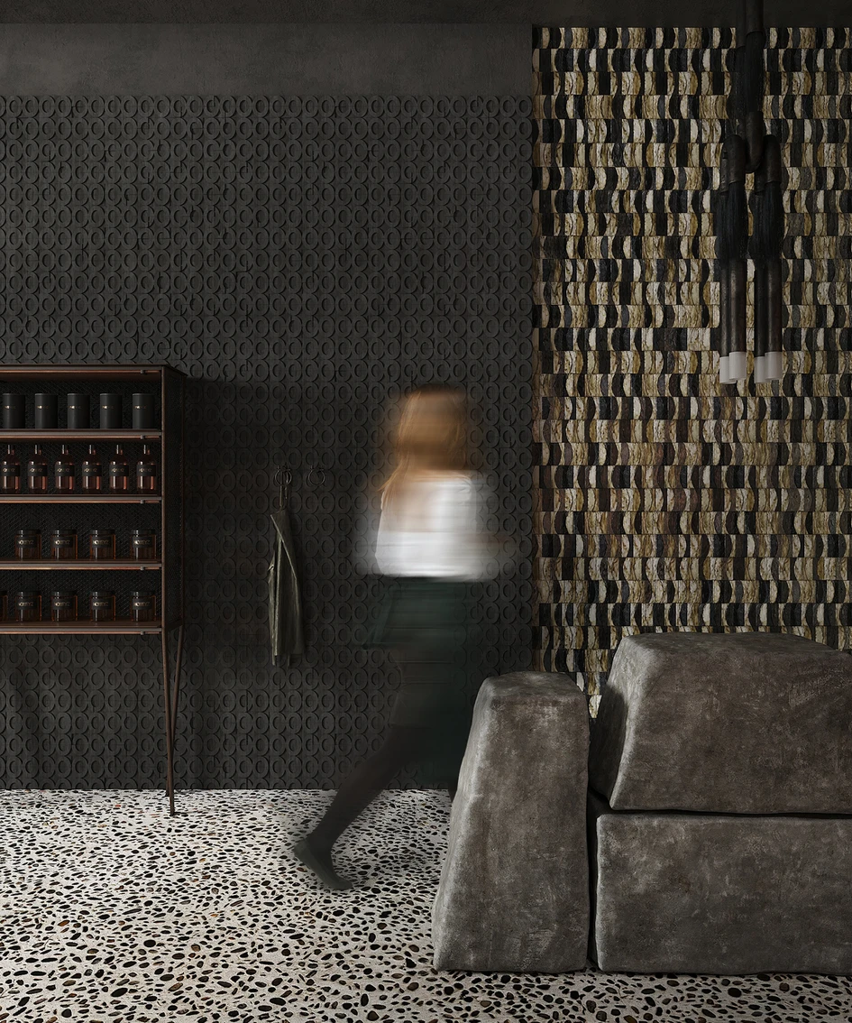 The dominance of concrete is reinforced by the subtle presence of complementary materials, which appear in selected and bespoke furniture and accessories. As an eye-catcher, a suspended Apparatus lamp can be seen in the distance; At the back of the premises there is a clay lattice screen from the Spanish firm Cerámicas Ferrés.