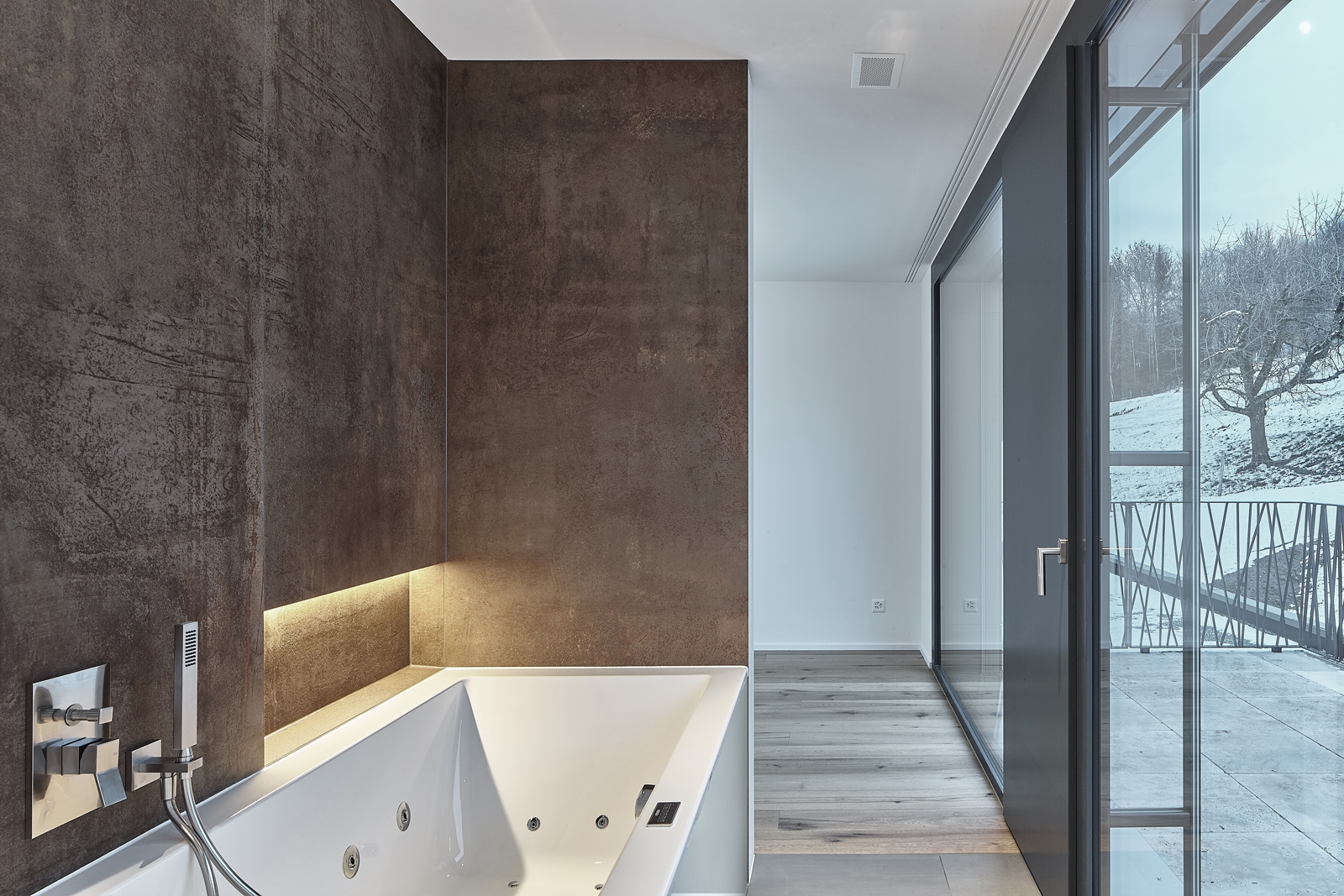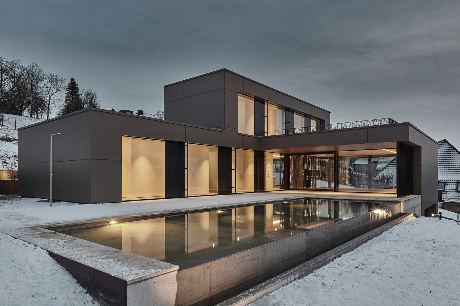 This sculptural building with breathtaking views was built on an exclusive residential location in Kanton Bern. The alignment of the parcel with a northern slope direction captures the wonderful panoramic view of the entire Jura mountain range. With strict building regulations, the architects proposed a three storey project that was harmoniously integrated into the existing topography.