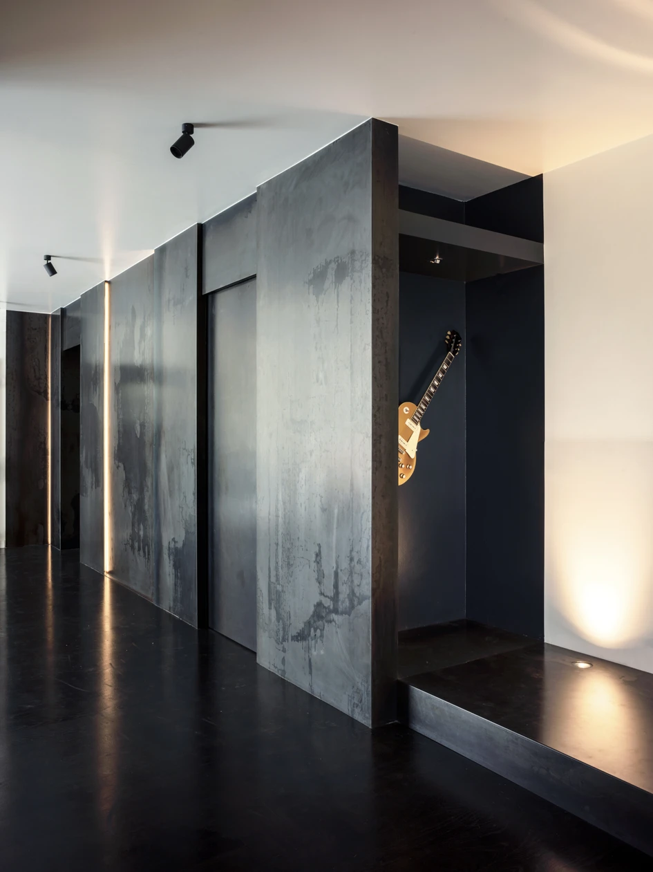 The particularly expressive steel was specifically selected and treated to preserve the original colors and oxidation of the rolling process. It has been folded and used to cover walls, doors and niches of the living room. Overlapping the sheets, some slots have been created to house linear lights which bring out the natural imperfections of the raw material.
