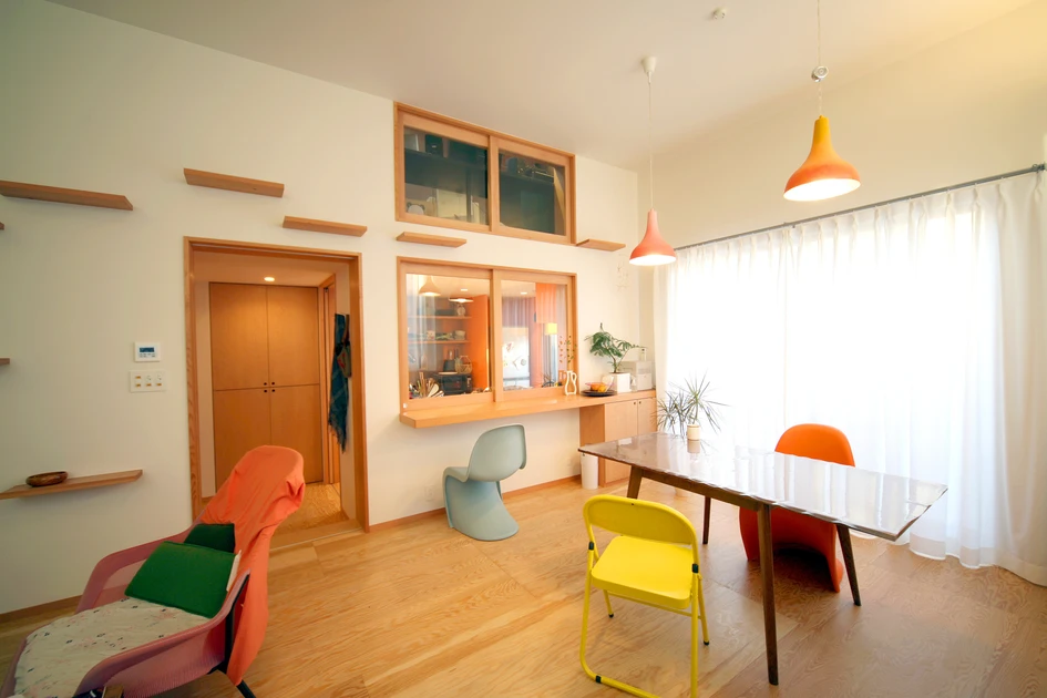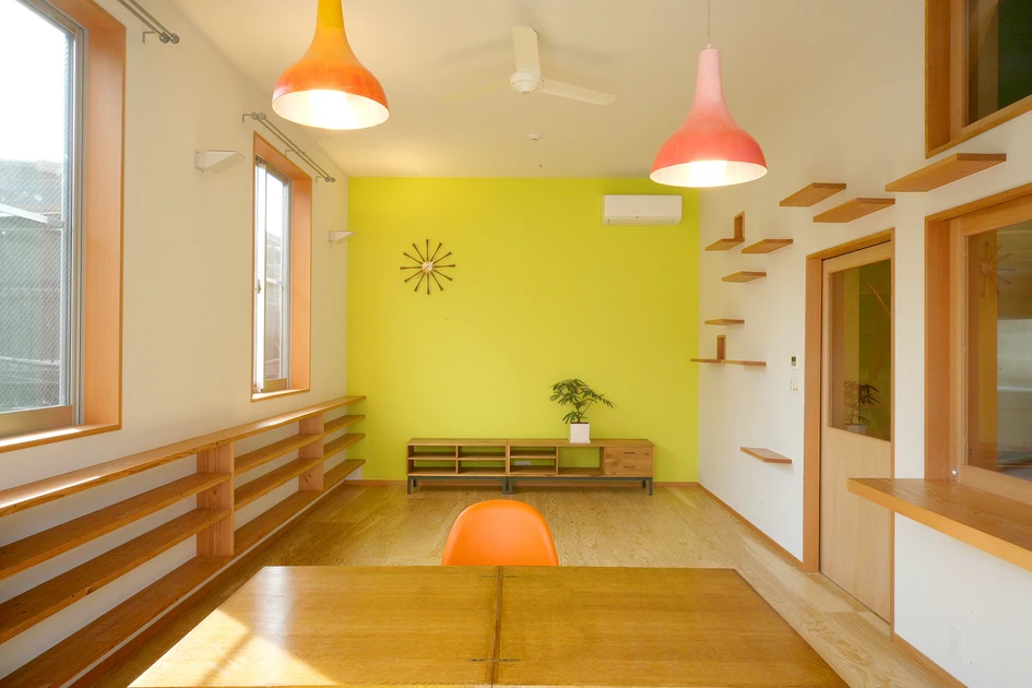 The house’s asymmetrical roofline maximizes both its playfulness as well as its volume. The architect has created within a complex interior space consisting of rooms of varying sizes, which are stack on top of each other over three floors. One would not be able to observe such a structure from outside of the house, but it reflects the layout of the area, which has a mixture of detached houses, both large and small. The biggest room in the house is the dining/living room, stretched horizontally to fit the whole width of the house. By extending the room vertically, the architect has opened up this room to the rest of the house. What look like shelves jutting out of one wall of this room are actually steppingstones for the pet cat to enter into the adjacent rooms through the openings placed higher up on the wall. This arrangement leaves the ample staircase and landings, which double up as a library, undisturbed from the burst of activities of the feline member of the family, while the rest of the family uses them as a place of quietude. Moreover, just as the garage became the visual focal point for the exterior of the house, the staircase, painted also brightly pink, signals a gathering of all the separate interior sections of Neko no Ie.