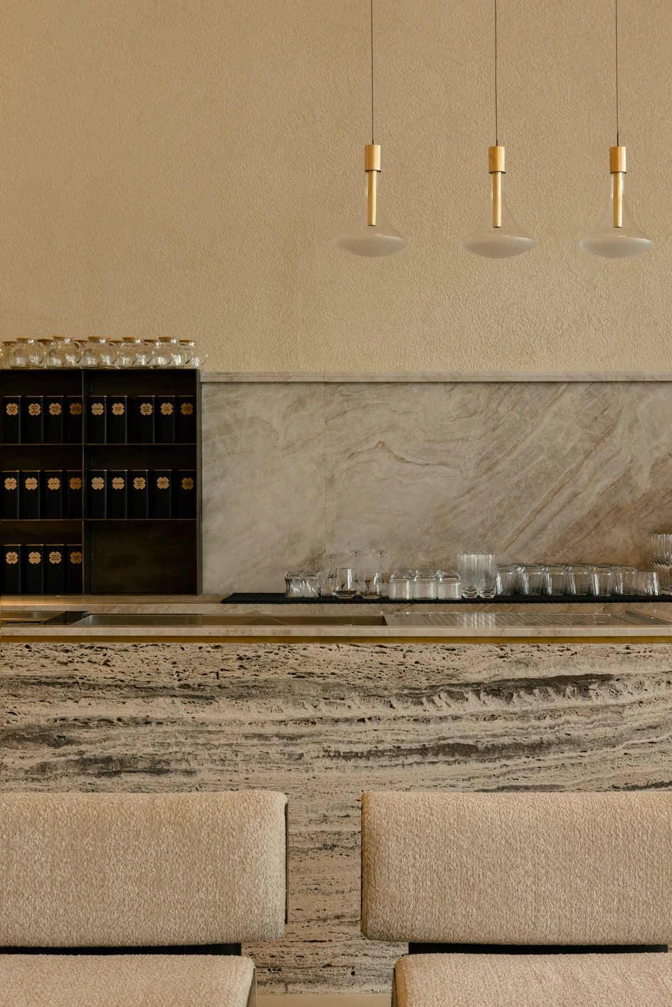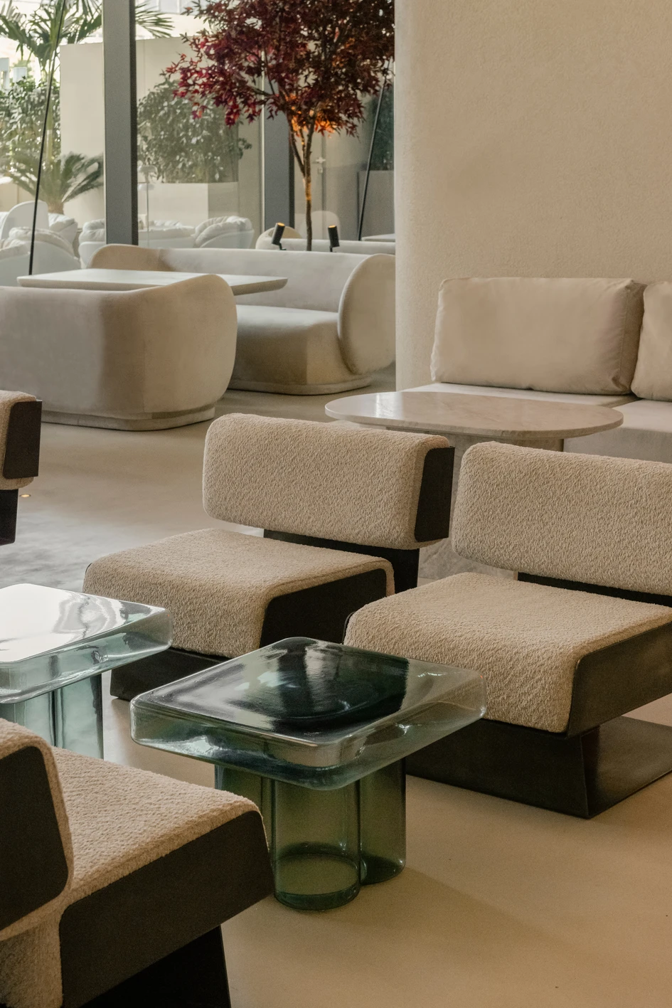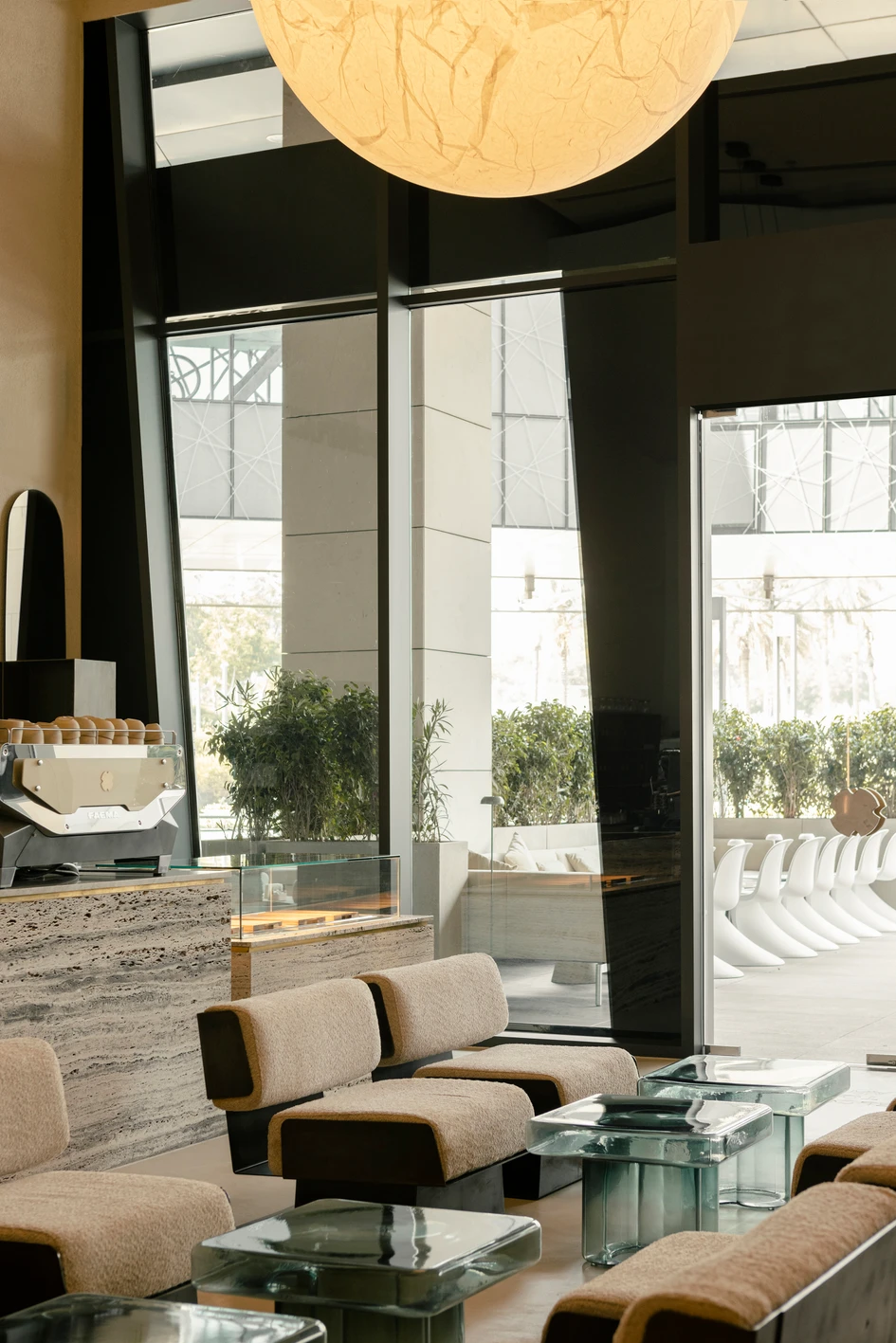 Highlights and decorative lighting are created as an extension of the conceptual idea. It is tuned to an atmospheric rhythm that flows through openings into every corner of the space. As evening falls, the Moon appears in the space, that is a light fixture with the same name created by the Davide Groppi group. Its light envelops the interior like the Earth's satellite, slowly immersing it in a nocturnal cradle. But this doesn't mean that life in the establishment stops: during this time, the guests are invited to enjoy the most comfortable, cozy atmosphere and refreshing cocktails. The tonal solution of furniture materials is positioned as part of a holistic color space: creamy bouclé, sandy quartz stone, natural oak veneer, and honey travertine interact organically in the landscape interior environment. Glass tables made by Miniforms refresh the sandy palette; natural light passing through them, makes them glow from the inside, changing them into vessels filled with transparent water.