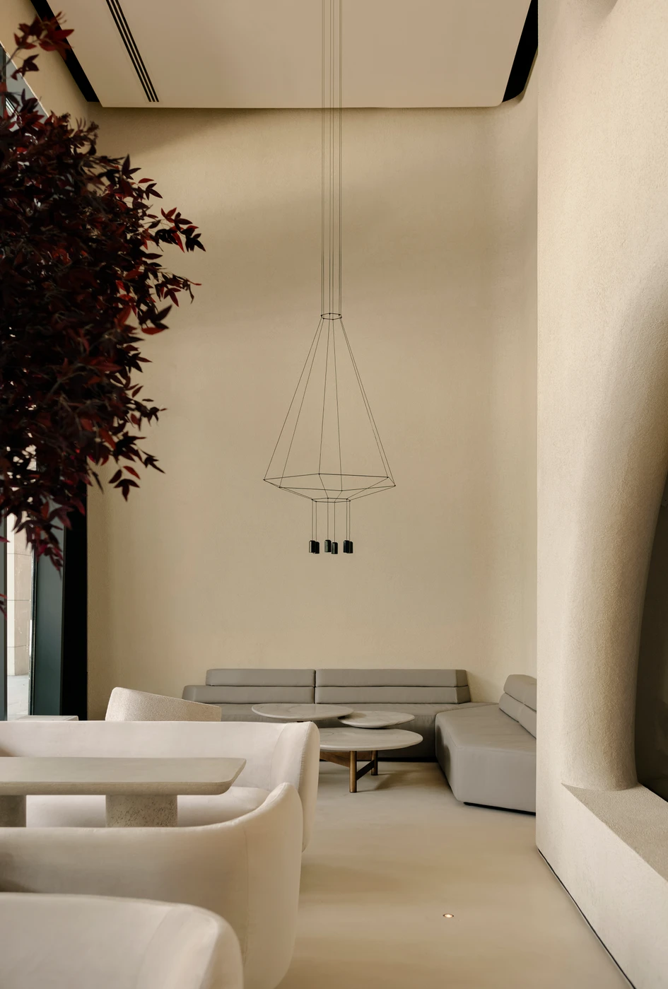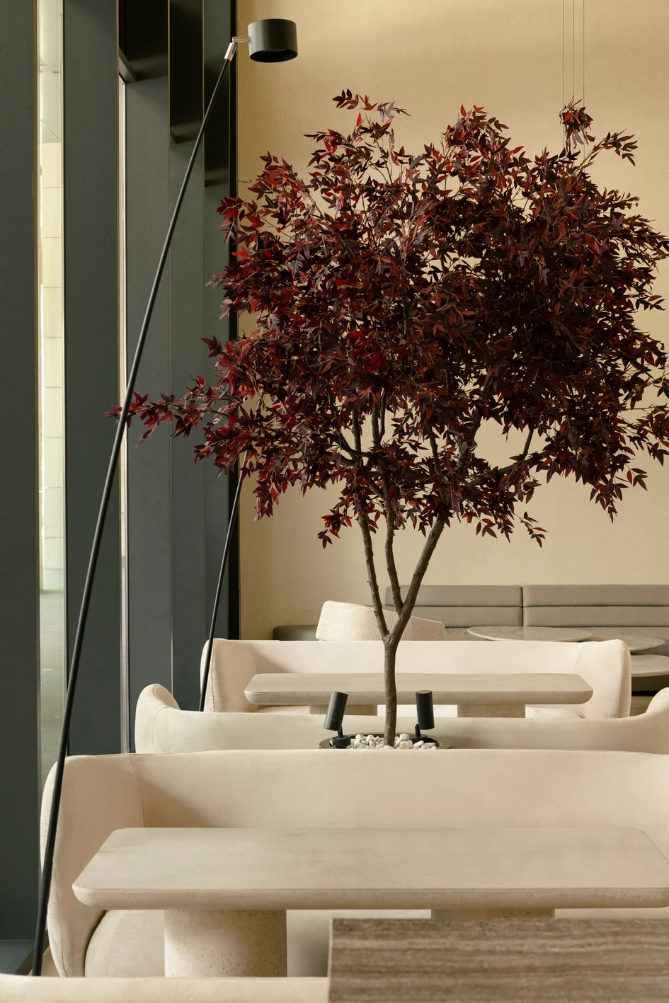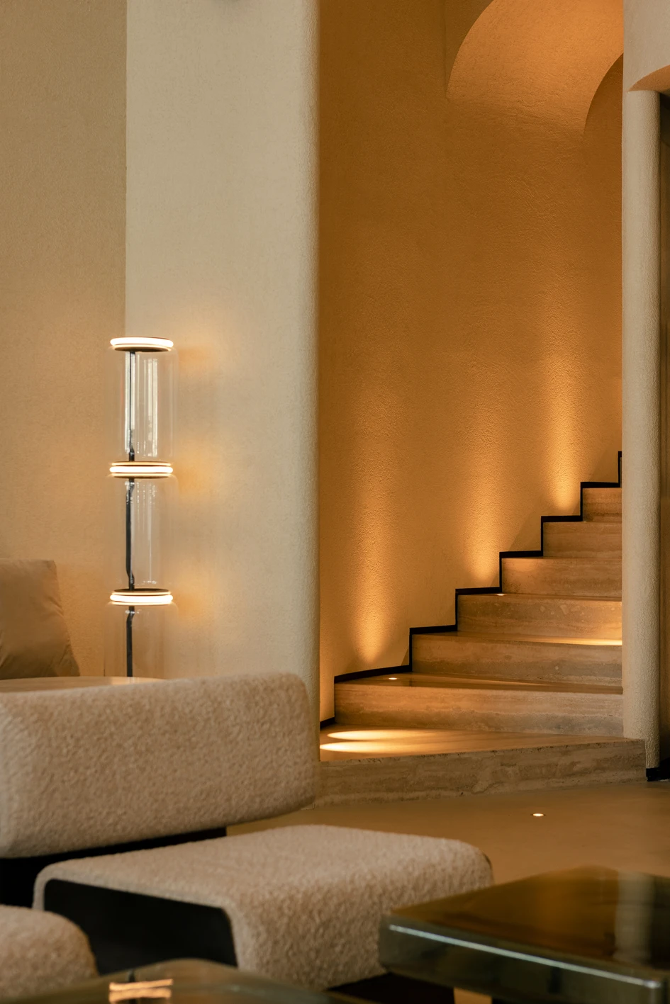 Highlights and decorative lighting are created as an extension of the conceptual idea. It is tuned to an atmospheric rhythm that flows through openings into every corner of the space. As evening falls, the Moon appears in the space, that is a light fixture with the same name created by the Davide Groppi group. Its light envelops the interior like the Earth's satellite, slowly immersing it in a nocturnal cradle. But this doesn't mean that life in the establishment stops: during this time, the guests are invited to enjoy the most comfortable, cozy atmosphere and refreshing cocktails. The tonal solution of furniture materials is positioned as part of a holistic color space: creamy bouclé, sandy quartz stone, natural oak veneer, and honey travertine interact organically in the landscape interior environment. Glass tables made by Miniforms refresh the sandy palette; natural light passing through them, makes them glow from the inside, changing them into vessels filled with transparent water.
