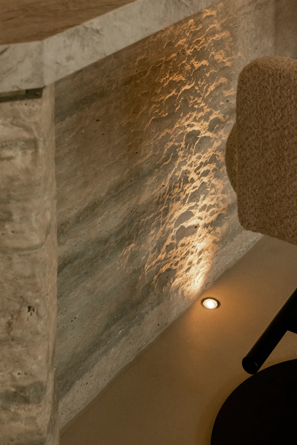 Not only the intriguing view opening to the peak of Burj Khalifa, but also the location of the new project, which is in a niche of the building, as if in an alcove, suggested the idea of how the internal structure should be created. Its tiered division dominates as one moves inward from the panoramic glazing, where the main entrance is located. The space of the first level is functionally divided by stone blocks of different types of travertine, the free visual arrangement of which organizes the hospitality zone and the area of two bars. The stone forms are created in smooth and rough processing, the latter mimicking the natural uneven surface of the stone, which gives the objects a pleasant self-finished appearance, like a thread reflecting human craftsmanship. The main hall branches out into private areas on two levels, hidden behind sculptural walls, and tunnels leading to auxiliary technical rooms. To get to the second level, to a secluded space, one needs to climb the stairs going up, following the curve of the wall. The upper level offers relaxed lounging: cocktail stone tables, subdued warm light, and a soft perimeter sofa on a podium, visually growing out of the volume of the walls. Through a sculptural opening, as if it were carved in the body of a rock, an extensive view of the terrace opens up.