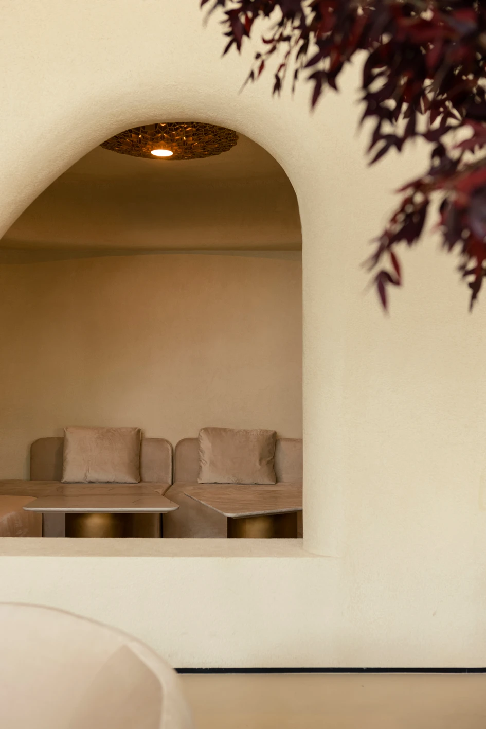 Exploring the idea of the desert as a place of cultural interaction and dialogue, we came up with the concept of an organic space, absorbing the motifs of nature, tradition, and craftsmanship. The smooth oval contours of the rooms resemble the structures that people have been carving in desert lands with hot climates since ancient times. The fluidity of architectural elements and structures refers to natural forms carved by wind and time itself. The light sliding over them gathers whimsical shadows that recede into the depth of space. The image of the desert as an elusive everchanging matter is reflected and imprinted in the wall finish. The palette of mineral plaster, both in raw and smooth finishes, is close to the natural color of sand.