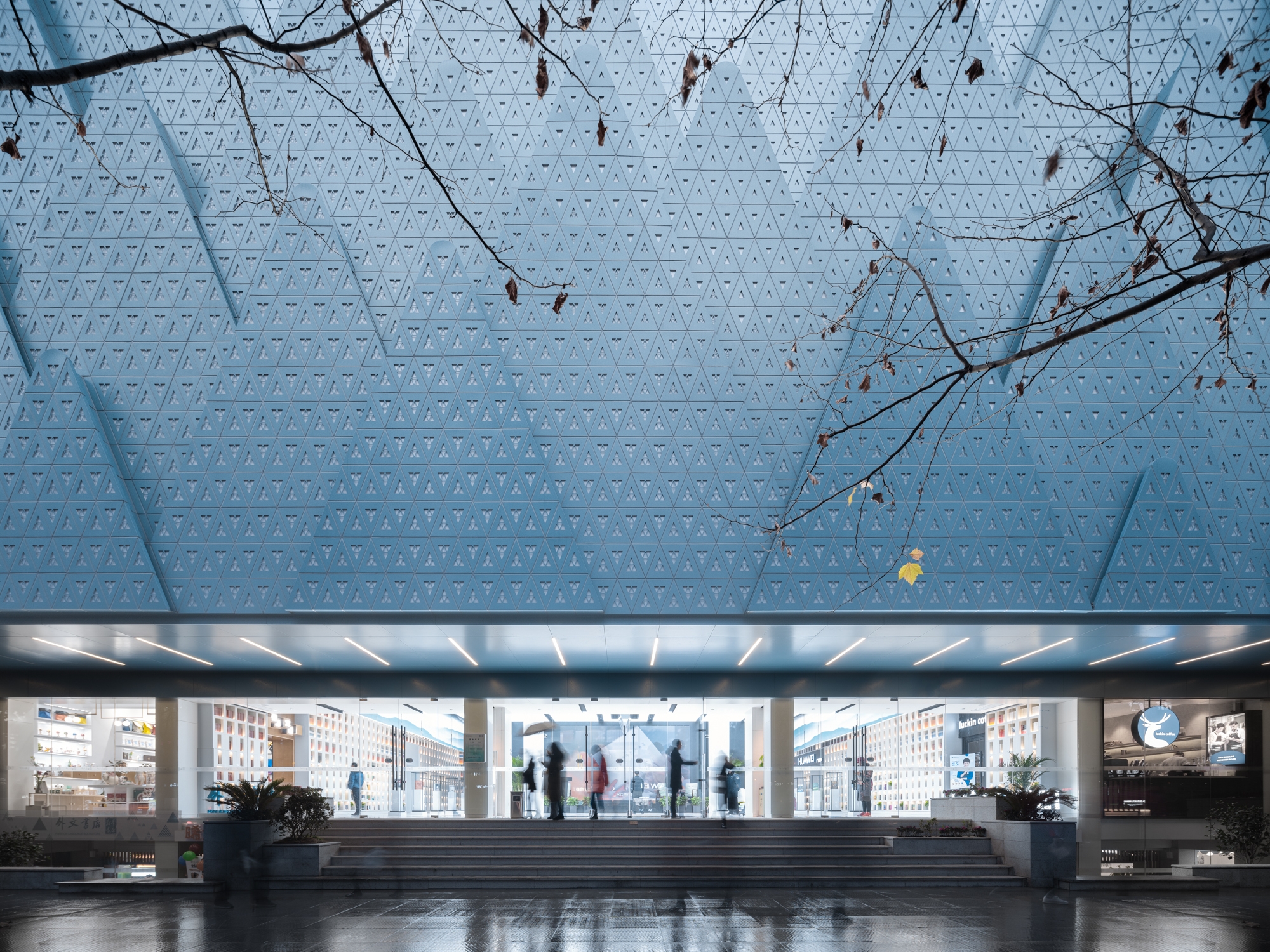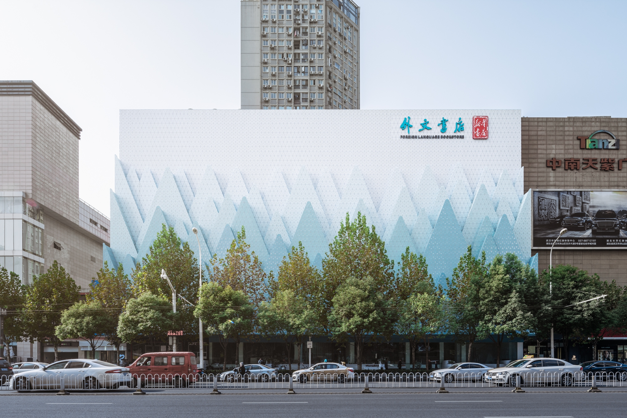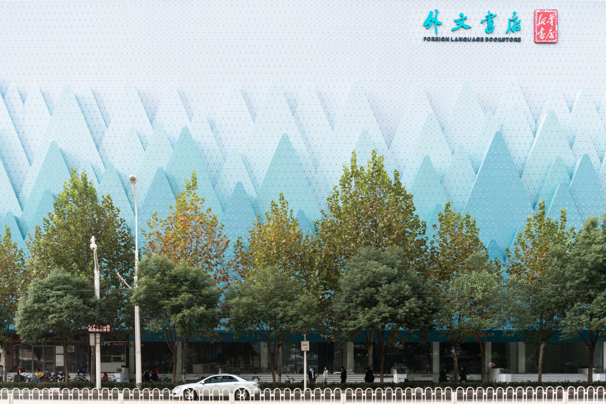 Our team decided to use perforated aluminum plate to create the atmosphere of layers of green hills, act as the background of the street trees and symbolize the new life of Hubei Foreign Language Bookstore. The new façade of the bookstore is also a manifesto, the abstract green hills open a window on the increasingly crowded Zhongnan Road and link the numb daily life to a whole new world.