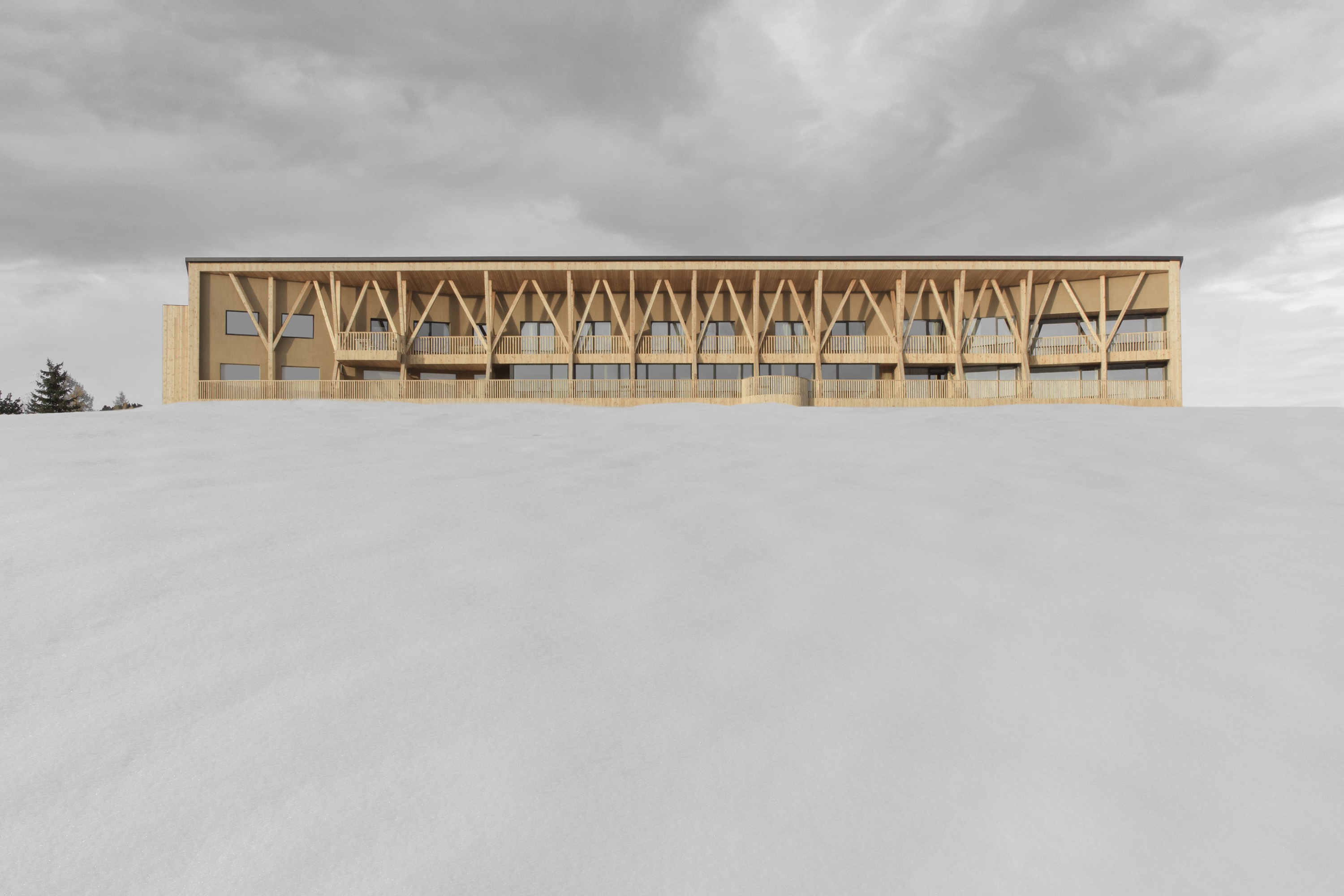 Positioned on the Alpe di Siusi (Seiser Alm) plateau at 1.900m above sea level and set within South Tyrol’s Dolomites UNESCO World Heritage site, the hotel’s humble origins date back to a simple 1930s mountain lodge. Granddaughter to the founder of the original Icaro lodge, Angelika Sattler commissioned MoDusArchitects to overhaul the structure and reimagine its identity. The various interventions include an underground parking extension, the separate staff quarters, a guest room addition, the reorganization of all of the common spaces including the pool area, and the sweeping, giant order colonnade of wood along the main façade that intercepts the breathtaking mountain views.