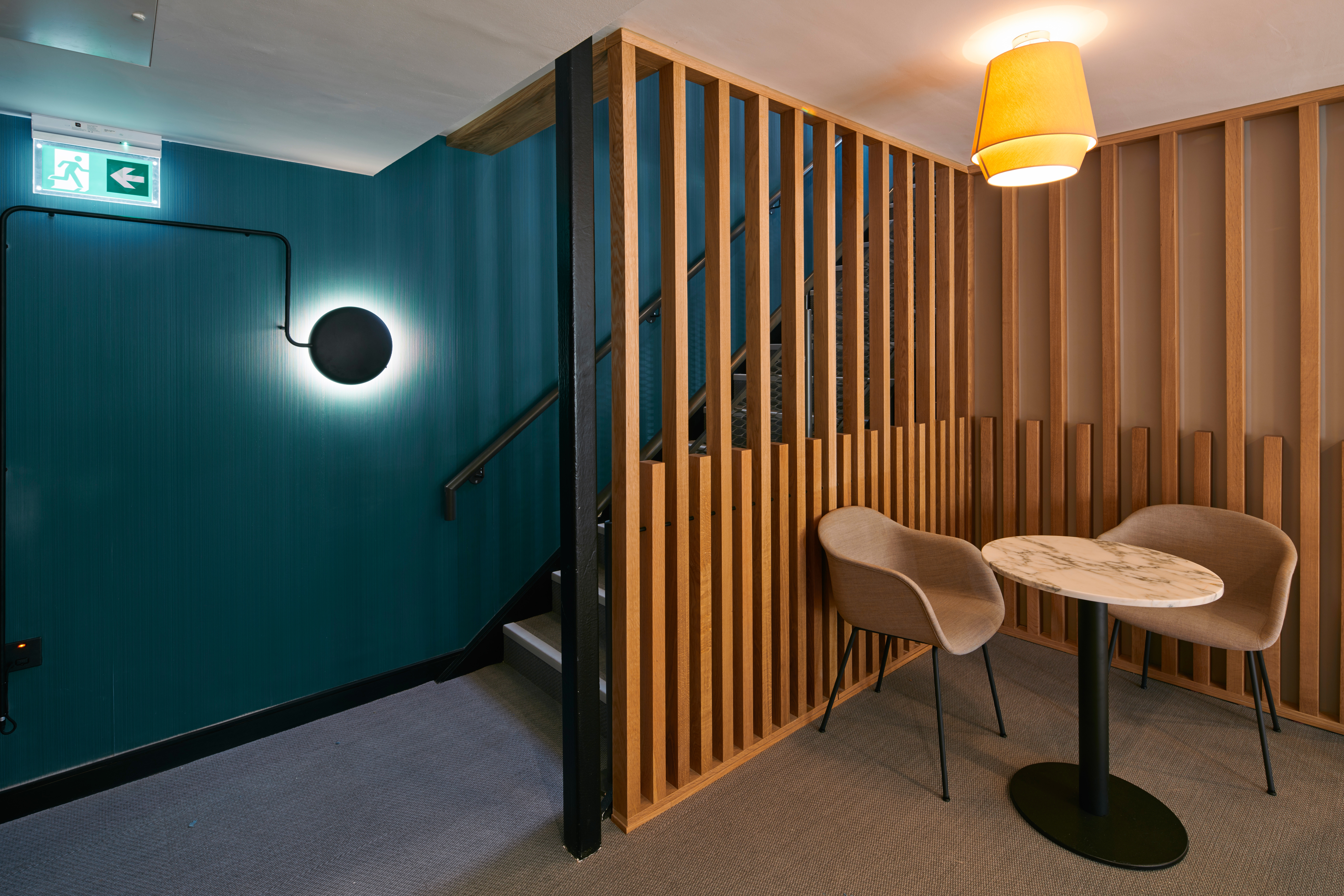 The stair features a glass balustrade and grey, powder-coated aluminium handrail. A second recurrent feature is planting and biophilia and we also see this here, incorporated into the second feature oak wall, which features integrated moss panels, at the rear right hand side of the lobby area. Planting throughout is by Urban Planters. A feature looped ceiling light was supplied by E2 Lighting, who supplied all the lighting on the scheme. Loose furniture in the space follows clean and contemporary lines and includes pieces by Hay, Pedrali, Muuto and Note Design Studio, all supplied by Form Furniture.