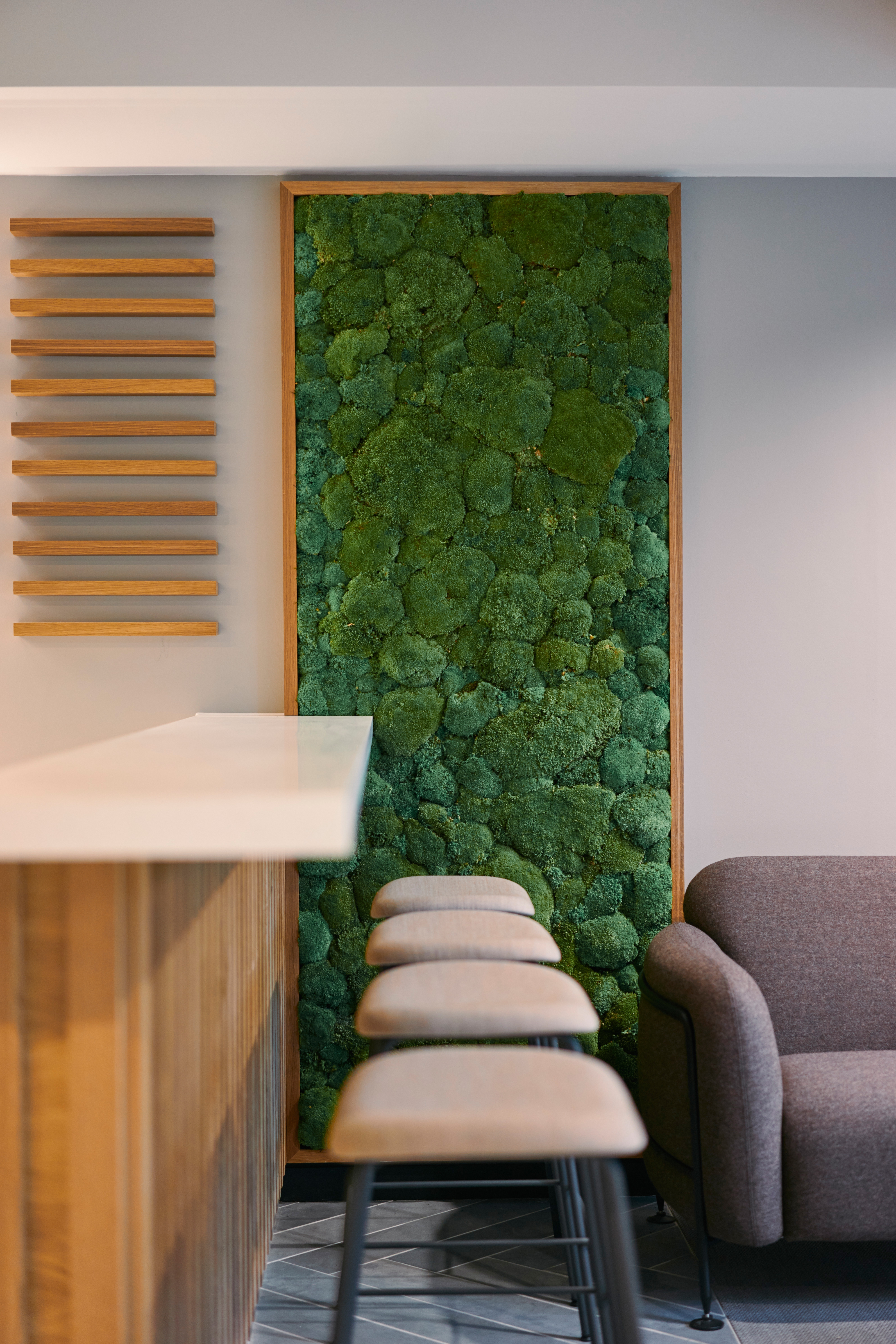 The bar itself is marble-topped with vertical oak panelling to the front. Flooring adds variety via a mix of woven vinyl tiles by Bolon, carpet from Milliken from the Clerkenwell range and two different finish porcelain tile herringbone segments in pale pink and grey, located directly alongside the bar. A further living green wall using moss creates an eye-catching vertical installation alongside the bar, whilst tropical plants are used near the internal entrance from the lobby lounge area. The Elements by Note pendant light is also used in this space as a linking element, located over the seating arrangement to the rear of the space.