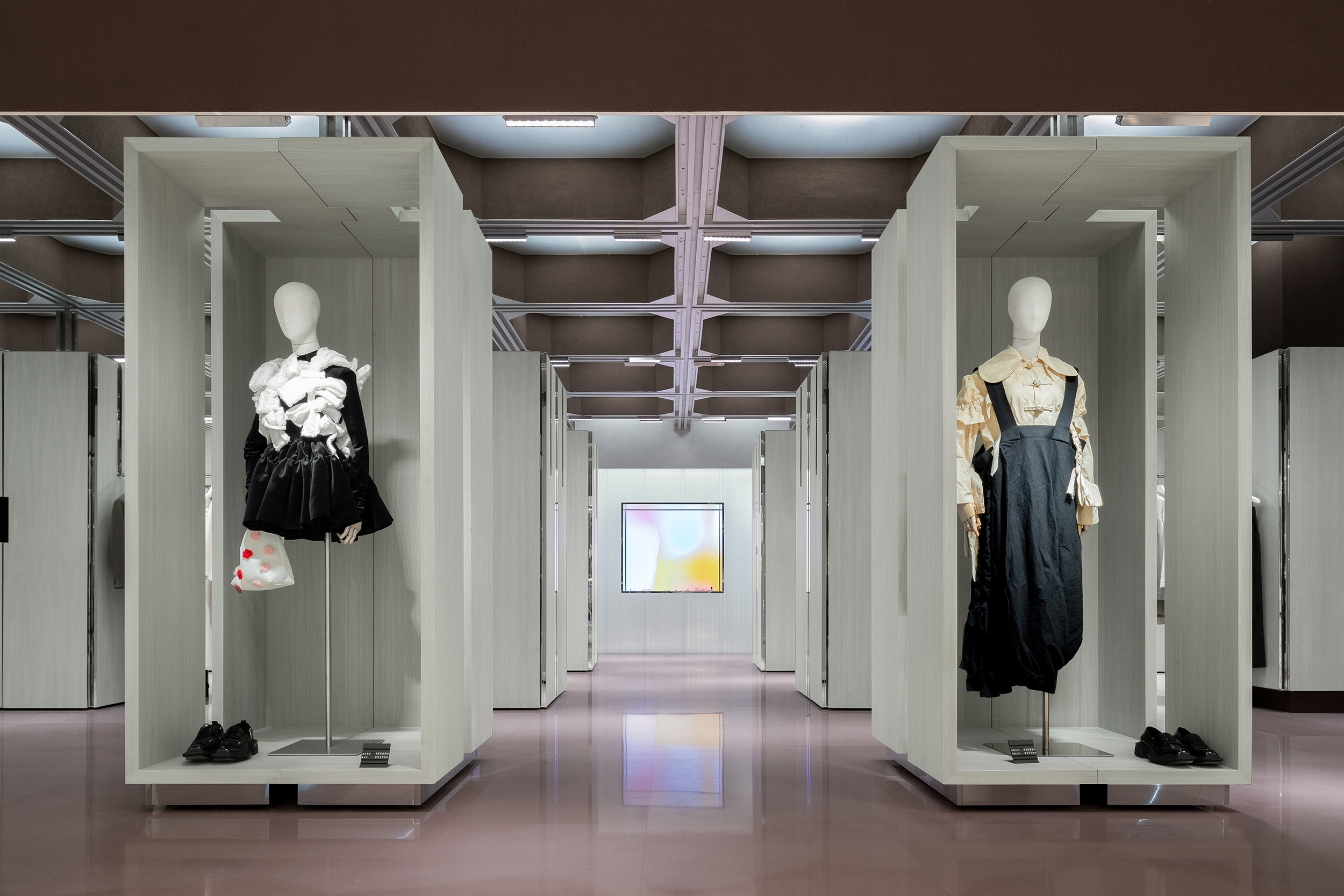 Arranged in an orderly manner, the columns endow the space with a distinctive character, which attracts customers to step in and wander between the columns (i.e. displayed brand clothes).