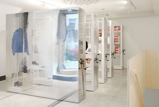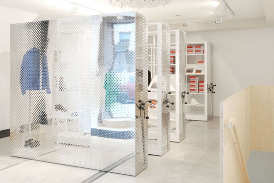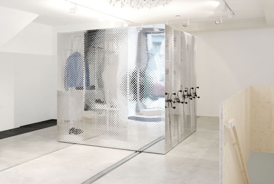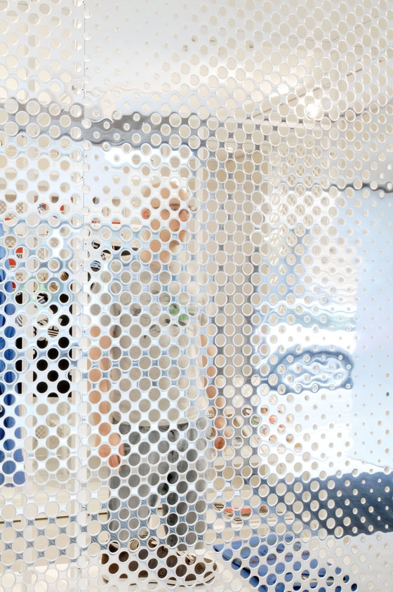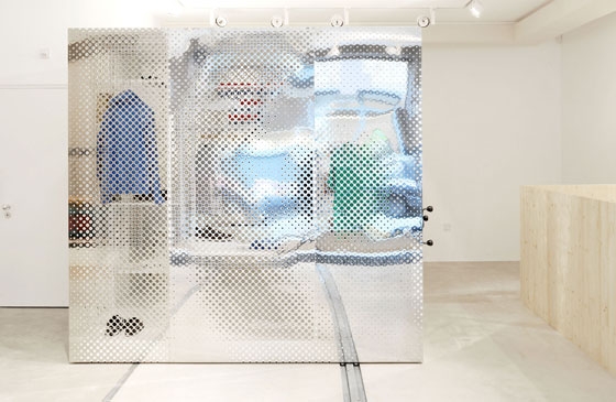 Die Oberfläche der Schränke besteht aus poliertem Edelstahl-Lochblech, welche zwischen Reflektion, Transparenz und Undurchsichtigkeit eine mehrdeutige Lesbarkeit innehält. Die Öffnungen in der Verkleidung enthüllen den Inhalt, während die Oberfläche die Umgebung widerspiegelt, wodurch ständig wechselnde Bilder erzeugt werden.
