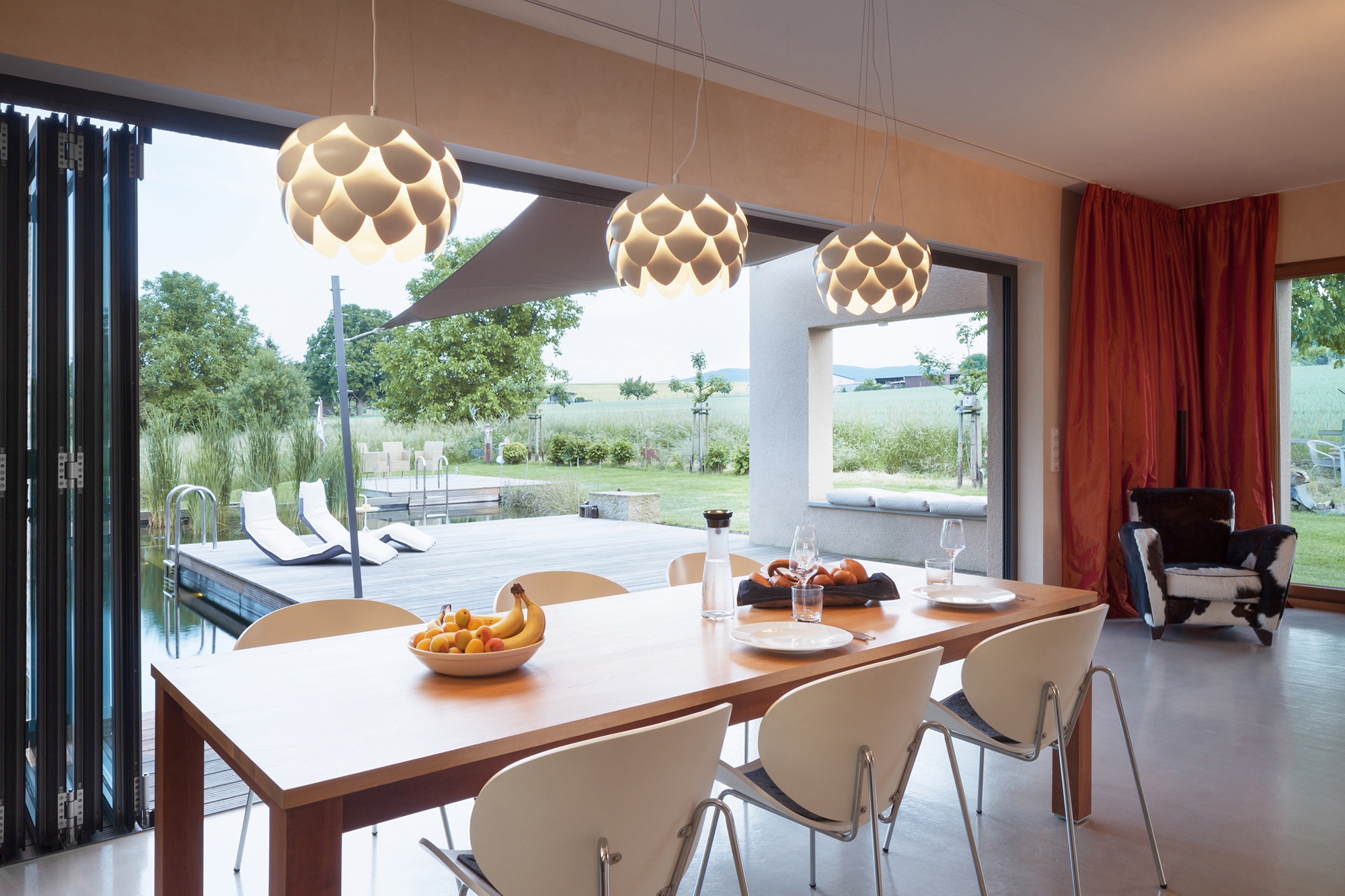 Aus der Perspektive der Bauhausphilosophie wird Kunst und Handwerk gleichermaßen vereint, doch genauso besagt diese, dass die Schönheit der Architektur erst dann entstehe, wenn sie „funktioniert“, sprich: den Ansprüchen der Bewohner gerecht werde. Ganz oben auf der Liste der anvisierten Funktionalität war der hohe Freizeitwert, den das neue Zuhause erfüllen sollte. Für dieses zentrale Leitmotiv galt es, den Innenraum mit dem Außenraum zu verbinden und die Grenzen dazwischen so weit wie möglich aufzulösen. Für die Architektin war bald klar, dass nur eine Glas-Faltwand die Barrieren in vollem Maße aufheben konnte. Sie entschied sich für den Hersteller Solarlux, bekannt durch seine hochqualitativen Glas-Lösungen. Das Glas-Faltwand-Modell SL 81 erfüllt ganz und gar das Leitmotiv: Es ermöglicht mit seiner sechsflügeligen Ausführung das Öffnen der kompletten Raumseite hin zu Terrasse, Garten, Teich und einer weitläufigen Aussicht. Die Bodenschiene wurde ebenerdig eingelassen und wirkt fast unsichtbar, zusätzlich gewährt die geöffnete Anlage auf diese Weise einen barrierefreien Übergang. Im geschlossenen Zustand hingegen entspricht die isolierte Glas-Faltwand einer Dämmung nach neuester Energieeinsparverordnung. Die faltbare Verglasung ermöglicht eine Öffnung des Wohnbereiches – seitlich im Ziehharmonika-Prinzip geparkt wird die Terrasse ganzflächig erschlossen.
