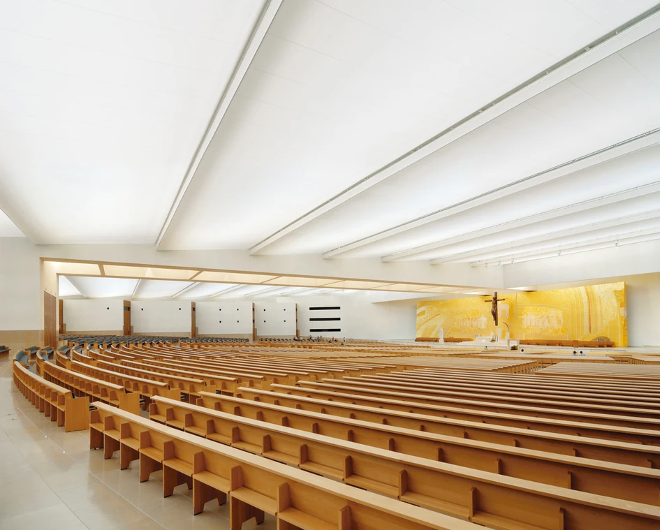 Das Dach des Kirchenraumes misst im Durchmesser etwa 100 Meter und wird von zwei gewaltigen Betonträgern getragen. Die abgehängte Decke der vollkommen freitragenden Konstruktion wurde mit insgesamt 18 Einzelmembranen von bis zu 600 m² je Stück ausgestattet. Die Grundfläche beträgt somit etwa 9.600m². Durch ein individuell für dieses Projekt entwickelte und detailliert auf die einzelnen Membranfelder abgestimmtes Spannprinzip ermöglicht eine beinahe unsichtbare Befestigung der hochwertigen Textilien. Der Durchhang der Gewebebahnen wurde auf ein technisch erforderliches Minimum reduziert und bietet den Eindruck einer vollkommen eben gespannten, hochtransluzenten Lichtdecke.