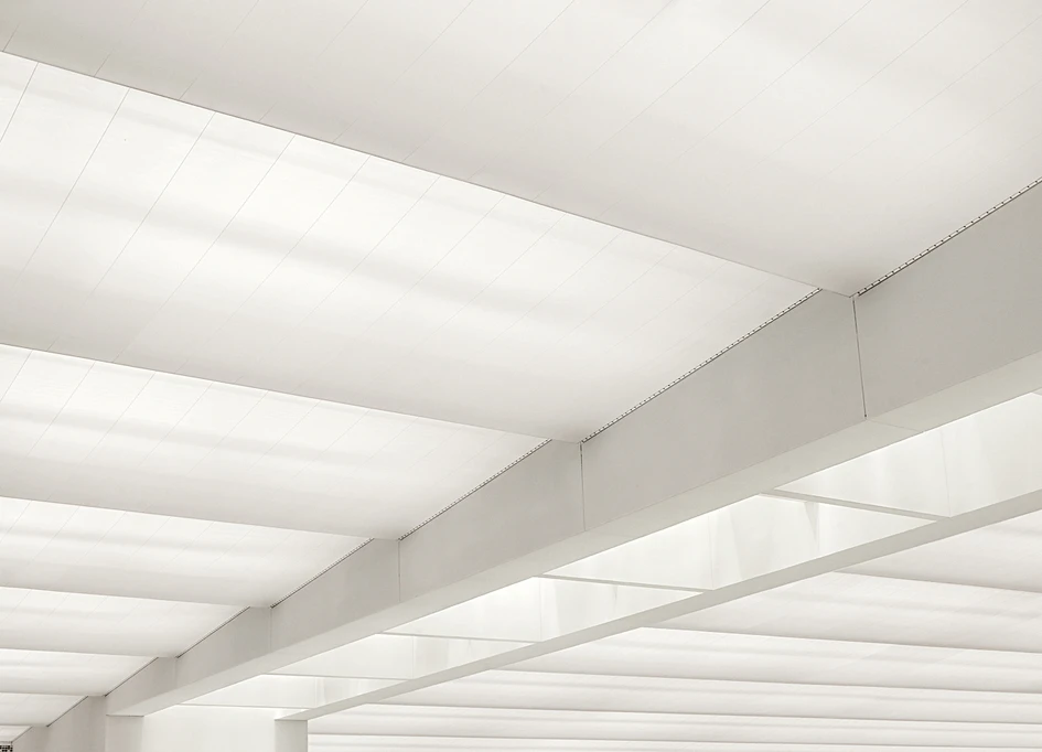Das Helioflon® Lichtgewebe der Firma Koch Membranen ermöglicht einen gleichmäßig ausgeleuchteten Kirchenraum. So wie der Tag voranschreitet, ändern sich auch die Lichtverhältnisse im Inneren der Kirche. Die zeitlose und helle Atmosphäre des Gotteshauses bleibt jedoch dank der bemerkenswerten, lichtstreuenden Eigenschaft erhalten. Aus einer Vielzahl von Materialien wurde Helioflon Lichtgewebe ausgewählt, da nur damit sämtliche architektonische und funktionale Anforderungen erfüllt werden konnten. Das Material ist schwer entflammbar nach DIN 4102, Brandklasse B1 und kann aufgrund seiner hohen Festigkeit bei gleichzeitig sehr geringem Eigengewicht enorme Flächen wie diese überspannen. Die Grundmaterialien sind quasi für die Ewigkeit entwickelt. Nachdem das Material gegen UV und Temperaturen vollkommen unempfindlich ist, ergibts sich über die Jahrzehnte seines Einsatzes so gut wie keine Alterung. Insbesondere bei Gotteshäusern, di üblicherweise auf einen sehr langen Nutzungszeitraum ausgelegt sind, kommt dieser Vorteil zum Tragen.