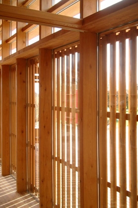 Wo möglich erfällt die Konstruktion mehrere Funktionen. An der Südseite dienen die Spanten auch als Leibung für die Fenster, an der geschlossenen Nordseite tragen sie das Bücherregal. Vor der Glasfassade dienen sechs verschiebbare Paneele mit vertikalen Lamellen dem Sonnenschutz. Auch sie sind aus Lärchenholz und können hintereinander vorbeigeschoben werden, was ein variantenreiches Spiel zwischen offen und geschlossen entsteht lösst. Die Paneele gleiten in Sögeschnitten in den Bodendielen wodurch keine weitern mechanischen Teile nütig sind.