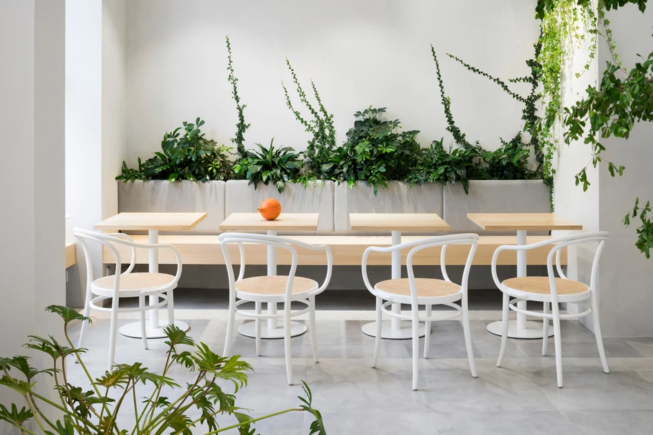 Clean, minimalist surfaces are deliberately designed as a neutral background for the color of food, people and events inside. The space is dominated by a wooden self-service counter with a glazed refrigerated display case and the necessary gastronomic equipment. The main view, framed by four regular portals, is closed by a wooden lamella wall with hidden doors to the guests' facilities. Other wooden elements are also made-to-measure from ash tree, which colors up the interior built on a combination of light gray finishes, lasure coating and ceramic mosaics. Everything is connected by pure white painting and interior greenery growing in various forms of space.