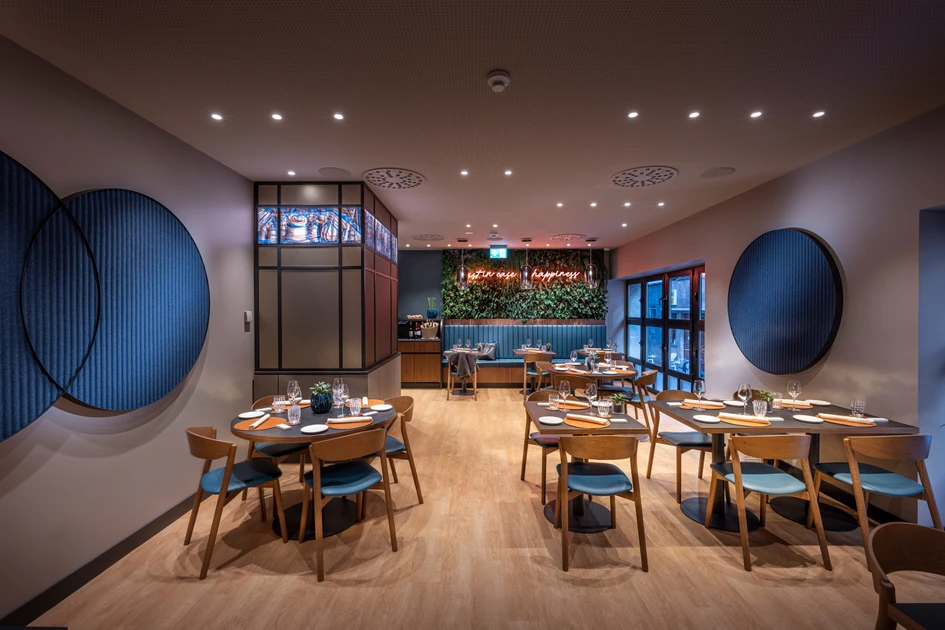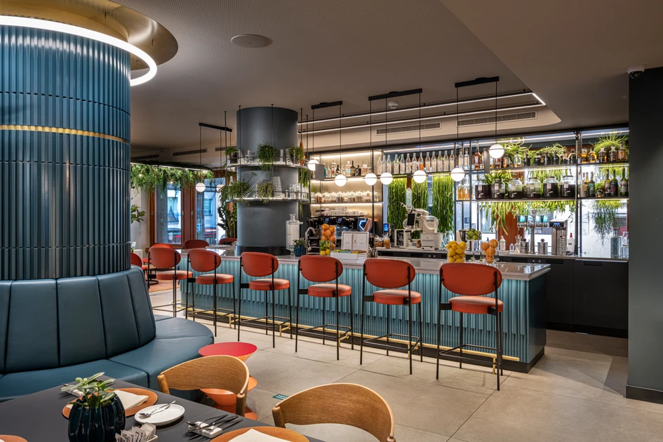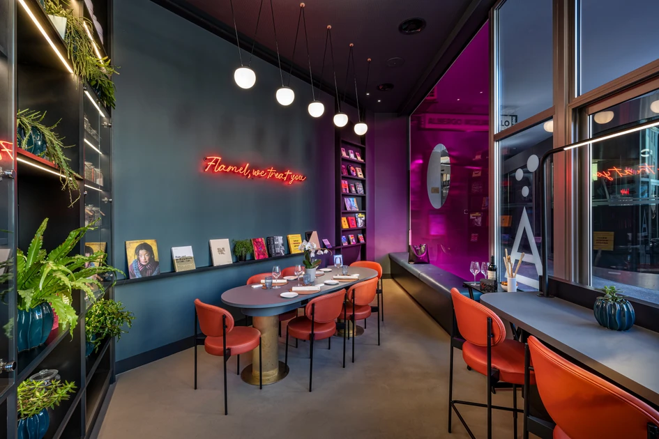 Lugano Dante is an empathetic hotel, where guests, tourists, citizens can take part to a conference or an event, spend a day of work or relaxation, enjoy a meal or indulge in an aperitif in a welcoming, eclectic surprising place, thanks to the new Flamel restaurant by the Maci brothers, a new F&B offer within the lobby and dining room spaces, conceived as a single free-flow space.