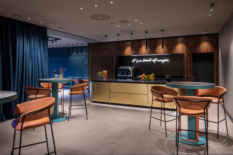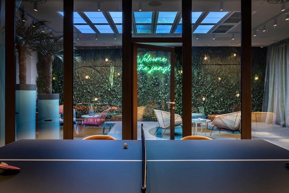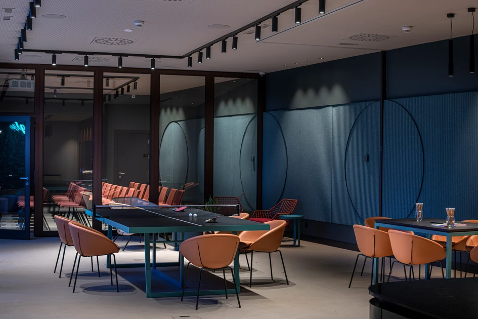 The space on the second floor, now dedicated to conferences and events, is redesigned as the Creative Box of the hotel, a place for work, even temporary, equipped with a winter garden around which spaces for business meetings or conference activities are developed, as well as more informal spaces where you can have fun playing table tennis.