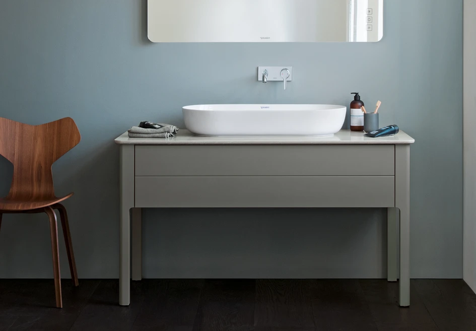 A comprehensive series of wash basins, mirrors and bathroom furniture. The three sizes of oval basins, with and without tap hole platform, all have very thin rims made from the unique DuraCeram® porcelain.