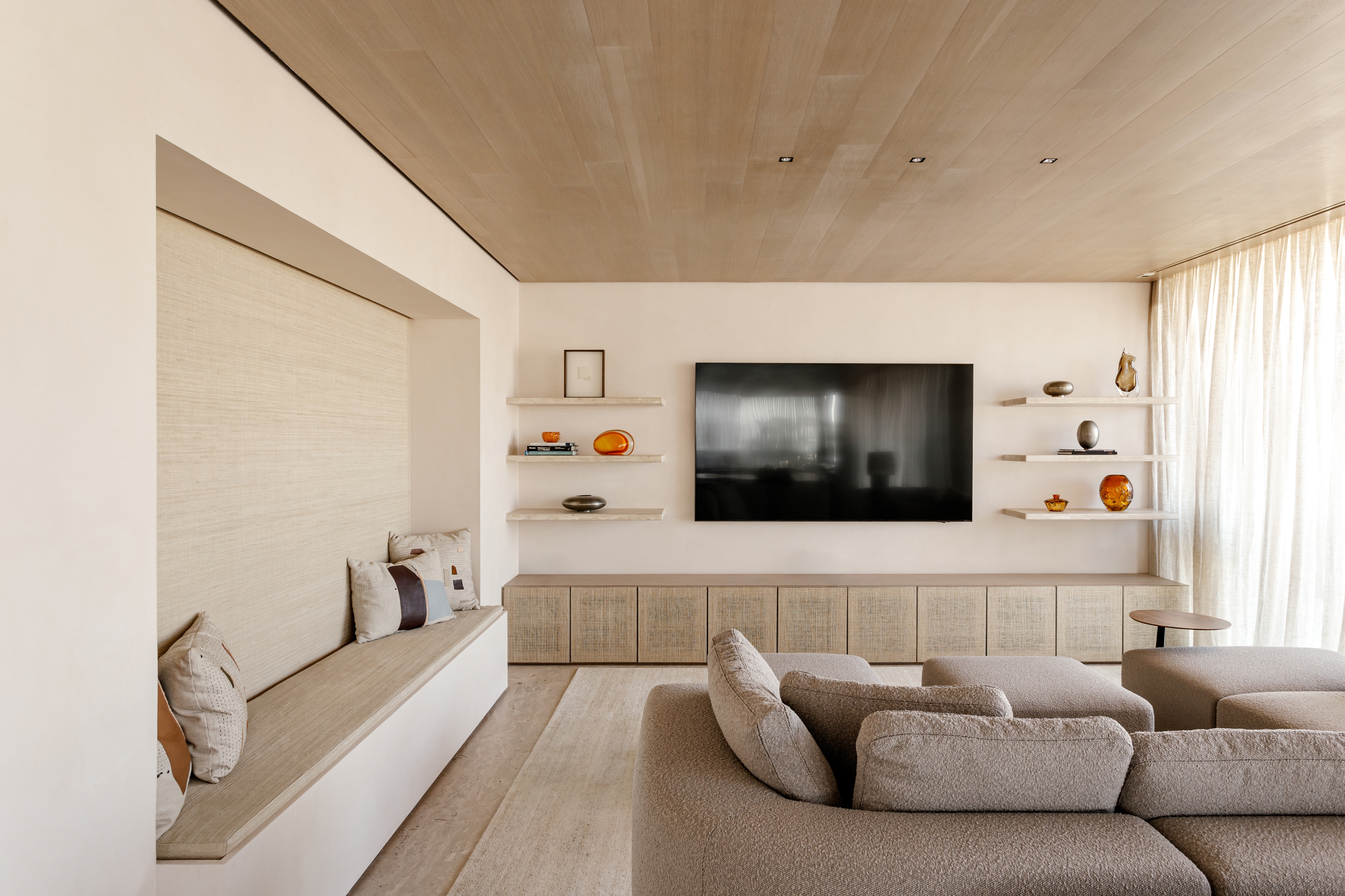 The artificial lighting design in the living area uses compact, efficient light sources, complemented by indirect lighting systems built into the cabinetry and the curtain track. The intensity controlled by automation, prioritizing comfort. The clean ceiling design reinforces a discreet approach.