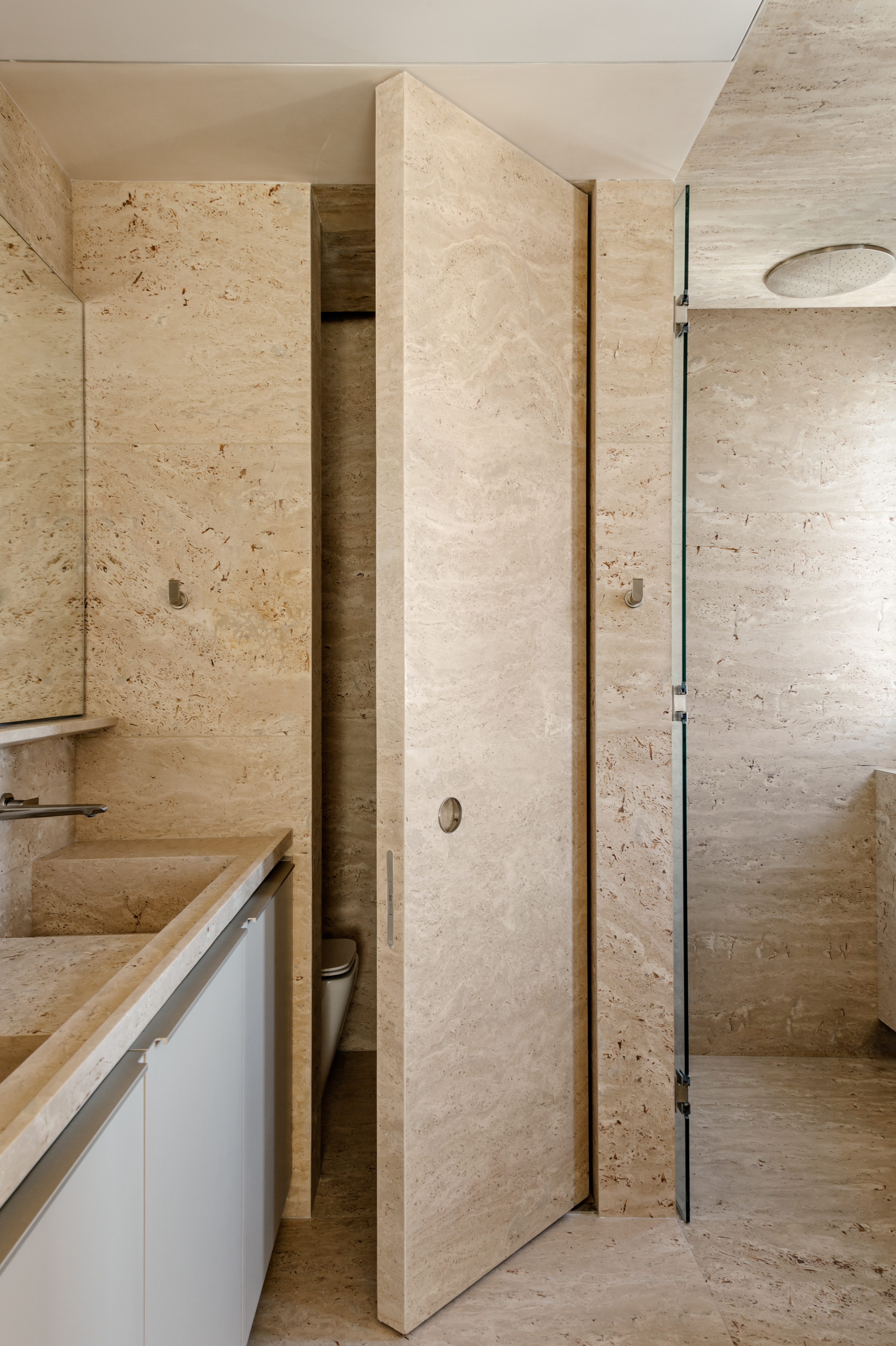 Marble panels completely cover the master suite bathroom, from the floor to the walls, countertop, and ceiling. The door to the private space is clad in the same material, and the circular metallic handle was custom-designed for the project, emphasizing the attention to detail.