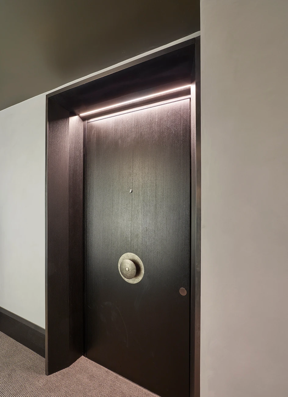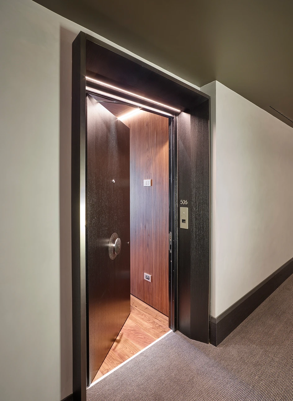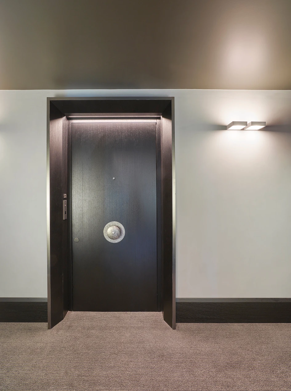 Die neutrale und strenge Designsprache der Architekten lebt mit den dekorativen Farben und Materialien und hebt so die Faszination und den historischen Wert des Ortes hervor. Umsetzung: EI DB Eingangstüren für die Zimmer