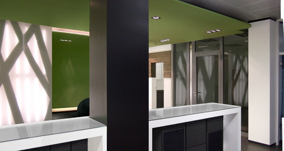Konsequentes Ablösen der raumbegrenzenden Wandscheiben von der Fassade, grosszügige, raumhohe Glastüren, vollflächig hinterleuchtete Glasflächen unterstützen die transparente Erscheinung der Gesamtfläche. Die Transition verbindet als zentrales Element die Bereiche Management und Service Center.