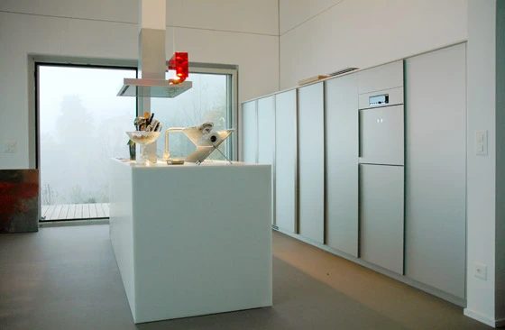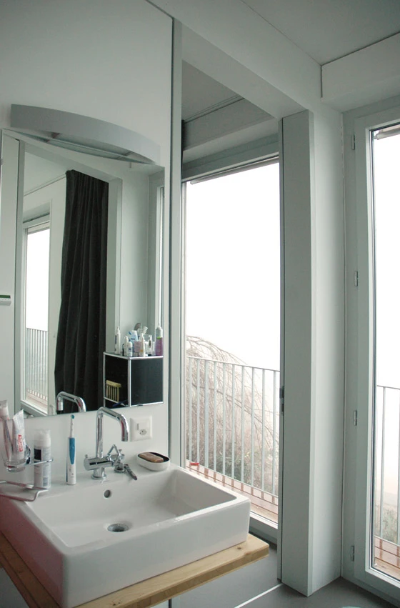 Im Innern lebt man im Rhythmus der Primärstruktur den Übergang vom Wohnteil zu den privaten Zimmern entlang dem Gebäude. Auf der Südseite wird offen gewohnt und gegessen. Die beeindruckende Aussicht wird mit grossen Fenstern gerahmt und der Aussenraum mit einer Terrasse zum Garten erschlossen. Die beiden Schlafräume und das Hauptbad richten sich zum See und zeichnen die Struktur des Gebäudes ebenfalls nach. Zudem sind sie untereinander, als auch zum Hauptwohnbereich mit verbindenden Türen entlang der Fassade öffenbar. So ensteht eine flexible Wohnform, die es immer ermöglicht ein Zimmer privat zu bewohnen oder das Gebäude in seiner ganzen Ausdehnung wahrzunehmen.