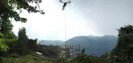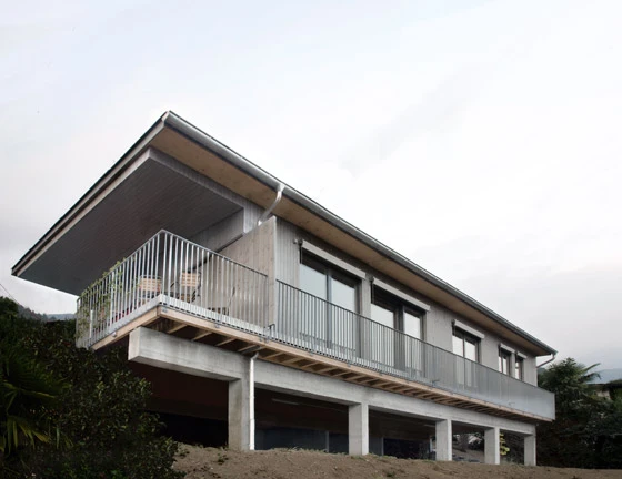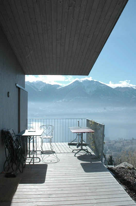 Das Haus befindet sich in Brione/TI über dem Lago Maggiore am Fusse des Monte Cardada. Die Parzelle liegt auf abfallendem Terrain und ist von der Strasse nicht in nützlicher Distanz erreichbar. Diese Rahmenbedingungen bestimmen die Setzung und die Bauweise des Gebäudes stark. Erst die gewählte Holzbauweise ermöglichte eine Montage mit dem Helikopter.