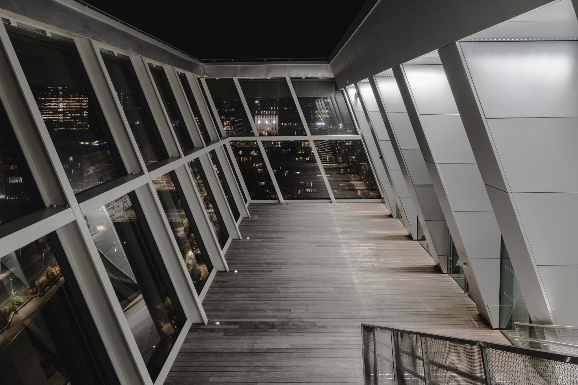 A building that bows respectfully towards the majestic natural scenery that surrounds it, an act of elegant reverence towards a city that aims to be entirely sustainable. It is the Munch museum, or Munch-museet, in Oslo, where the legacy of Norwegian artist Edvard Munch has found a new home. The expressionist painter left over 1100 paintings, 4500 drawings and watercolours, 18000 graphics, and 6000 books, along with letters and other documents. Originally preserved in the museum in Tøyen, which opened in 1963, his work is now housed and exhibited in this 13-storey, 26,300-m2 building. It is one of the world’s largest museums dedicated to a single artist, and a new architectural landmark in the Norwegian capital. The monumental museum overlooks Oslo’s fjord and is a distinctive addition to the city’s skyline. It was designed by the Spanish architectural practice Estudio Herreros, founded by Juan Herreros and Jens Richter, in collaboration with the Norwegian firm LPO Arkitekter and features an imposing 60-metre-high tower inclined at a twenty-degree angle towards the waterfront of Bjørvika Bay. The building is clad in recycled, perforated aluminium panels of varying degrees of translucency that create an ever-changing perception of the building as it reacts to the city’s climate and light conditions throughout the day and the seasons. The wavy aluminium panels screen and reflect sunlight effectively to maintain a stable temperature inside the exhibition rooms. Environmental and energy sustainability determined many of the architectural choices, such as the complex’s emissions, which are less than half those of conventional modern buildings. The tower rises from a three-storey podium whose lobby, a continuation of the surrounding covered public space, houses restaurants and bars, together with recreational, commercial and cultural areas. Vertical circulation guides visitors from the lobby through the exhibition rooms and on towards the roof terraces, offering them the opportunity to explore Edvard Munch’s artistic legacy alongside magnificent vistas of Oslo’s historical layers.The interior of the tower is divided into two zones. The first is a “static” part with a reinforced concrete structure, which houses the works of art in specific light and humidity conditions. The second is a “dynamic” zone, where visitors can move from floor to floor while enjoying the view of the bay through the large glass facade. Indeed, this was the design concept: to create an art centre for both young and old that would act as a link between the works of the great Norwegian painter and the surrounding urban area. The museum’s lighting design played an integral role in the development of its sustainability and was handled by Multiconsult, a construction and architectural consulting company. They chose L&L Luce&Light fixtures to light part of the building inside and out. The lighting design helped define the identity of the spaces and create the desired atmosphere using SNACK 1.3 36W linear profiles. In a version with 10° narrow optics, 4000K colour temperature and a custom black finish, they are fixed to the ceiling with brackets and arranged in straight lines to illuminate the building’s high walls with a grazing light that accentuates the verticality of the space. Other L&L fixtures are used on the open terrace: LITUS 1.6 outdoor recessed fixtures, 2.5W, 4000K, with diffuse optics, set in the wooden floor at the base of the glazing, mark its outer edge, while RIVER WALL 2.0 linear profiles, 40W, 4000K, with 10°x40° elliptical optics and brackets, in a custom version with a grey finish, light the terrace access areas from above.