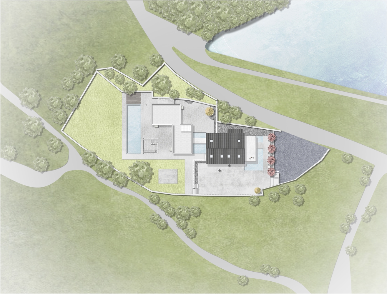 There is a swimming pool designed in the west courtyard, a sunken plaza next to swimming pool that can accommodate 6 to 8 people at the same time. We design the section between swimming pool and sunken plaza as the “Bar”, the guests could also have a drink and chat with friends at the "Bar" while swimming. The east, south and west courtyards are enclosed with glass railing on the south side, the site boundary is visually blurred, guests in the courtyard look out over the distant village without hindrance.
