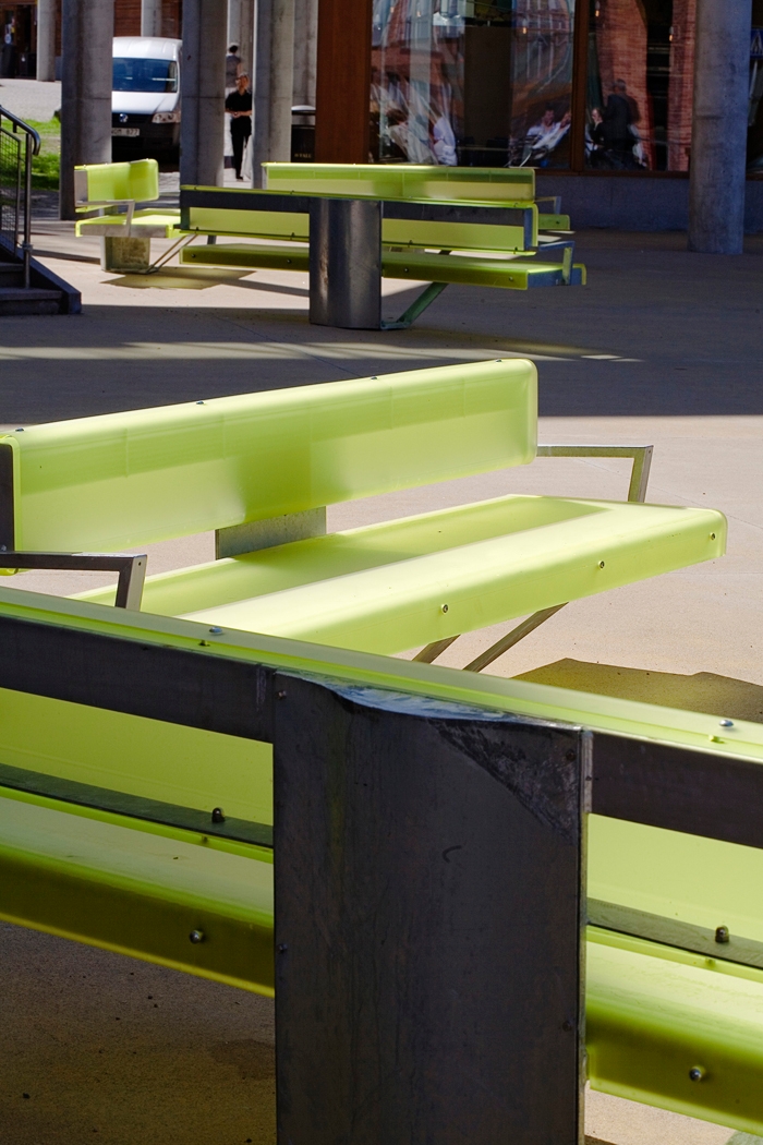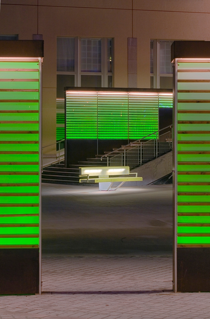 Square is made out of cast in site concrete. Benches have acrylic seats and steel frame. Light walls are at the same time space dividers and fixtures. Old ramp to garage is also covered with Light Walls. Al the lighting is DMX controlled, which means light can follow music.