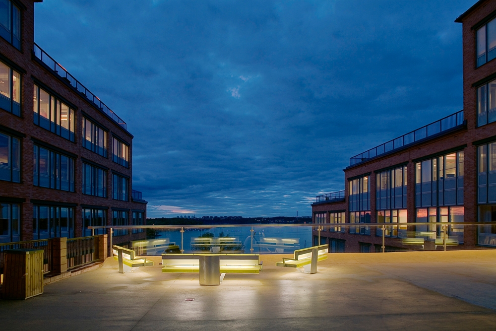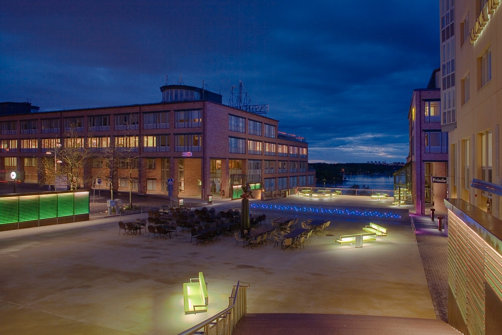 Nacka Strand is located some 10 kilometers out from Stockholm. It was mainly built in 80’s following architect Nyren’s plans. Nacka Strand has some 200000 sqm of offices and housing and it is regarded as one of the good examples of 80’s architecture. The site is great, located to a beautiful slope opening to sea. “I was so happy to have this chance to go there and have a look”, Vesa Honkonen tells. “For me it is important to feel the place, since I believe that where ever there is a problem, the solutions are already there, you just have to be able to feel and see it”.