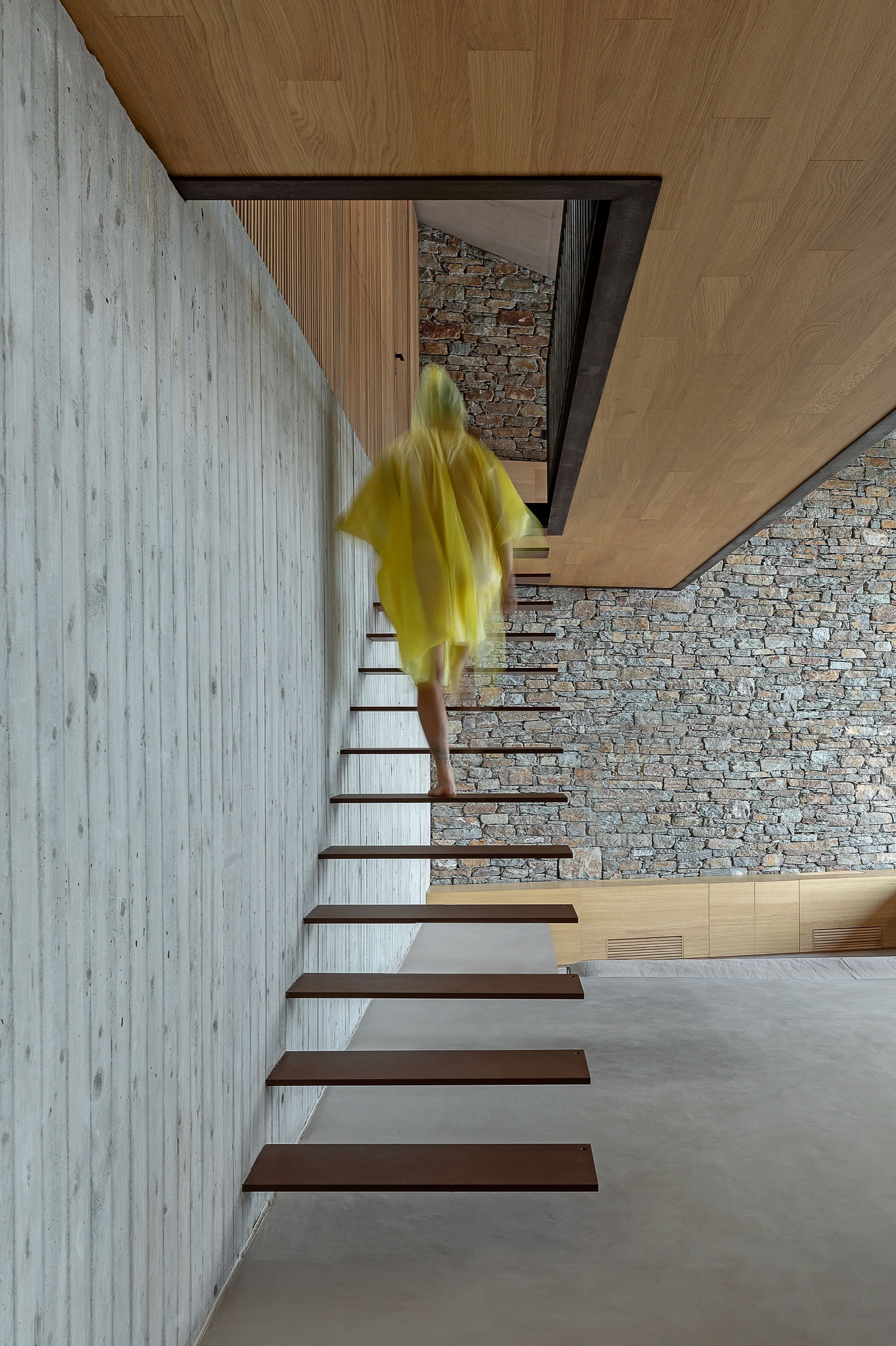 They result from severing and removing part of the rock. This rough feeling of a natural cavity was what we aimed to recreate with our choice of materials and color palette. Stone, exposed concrete, wood and metal are used with precision to create coarse inner shells.