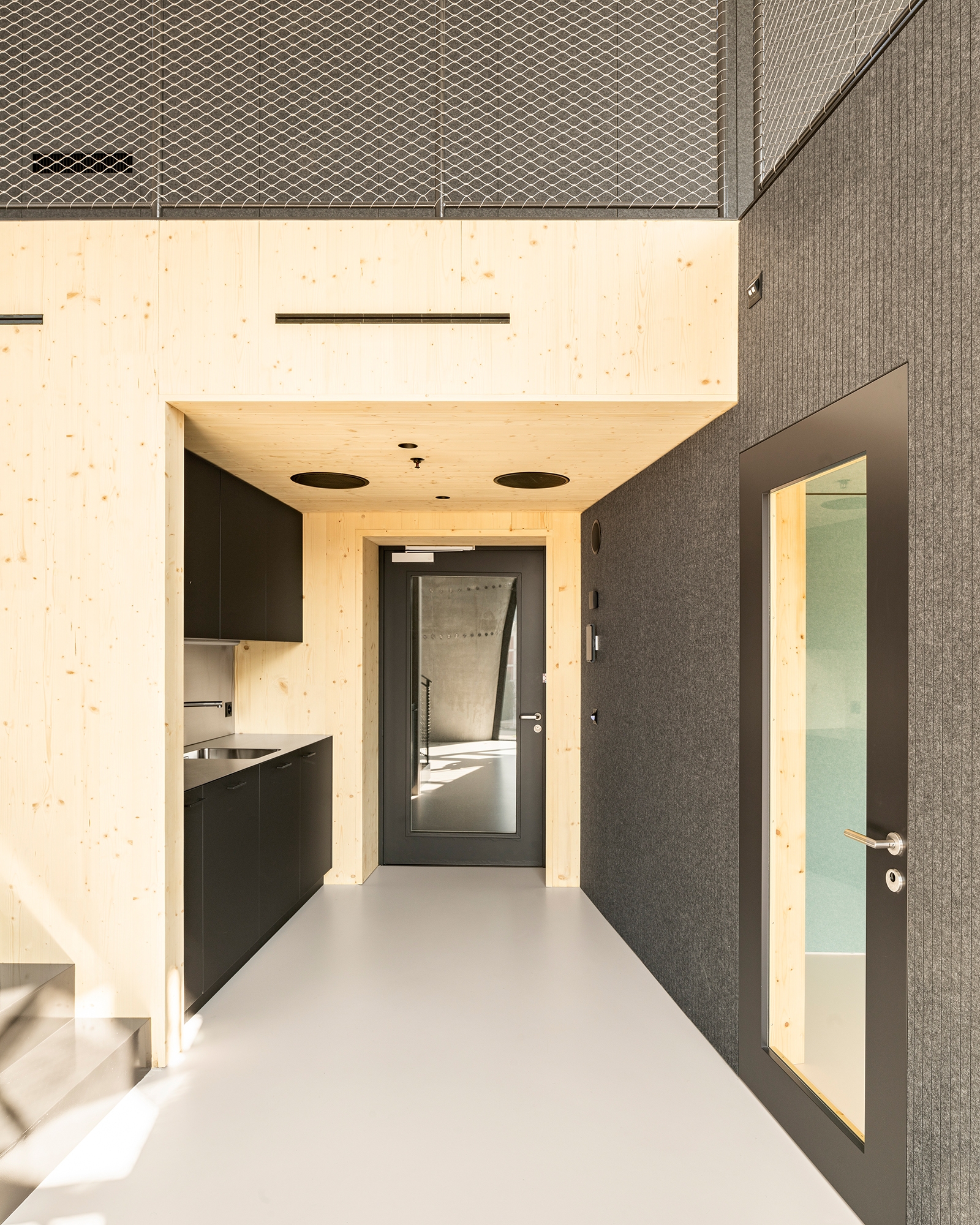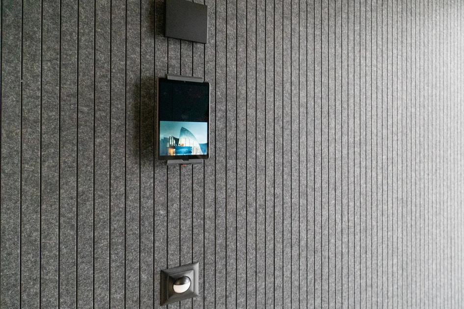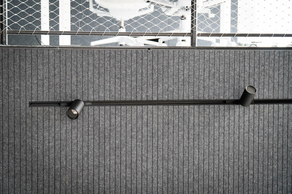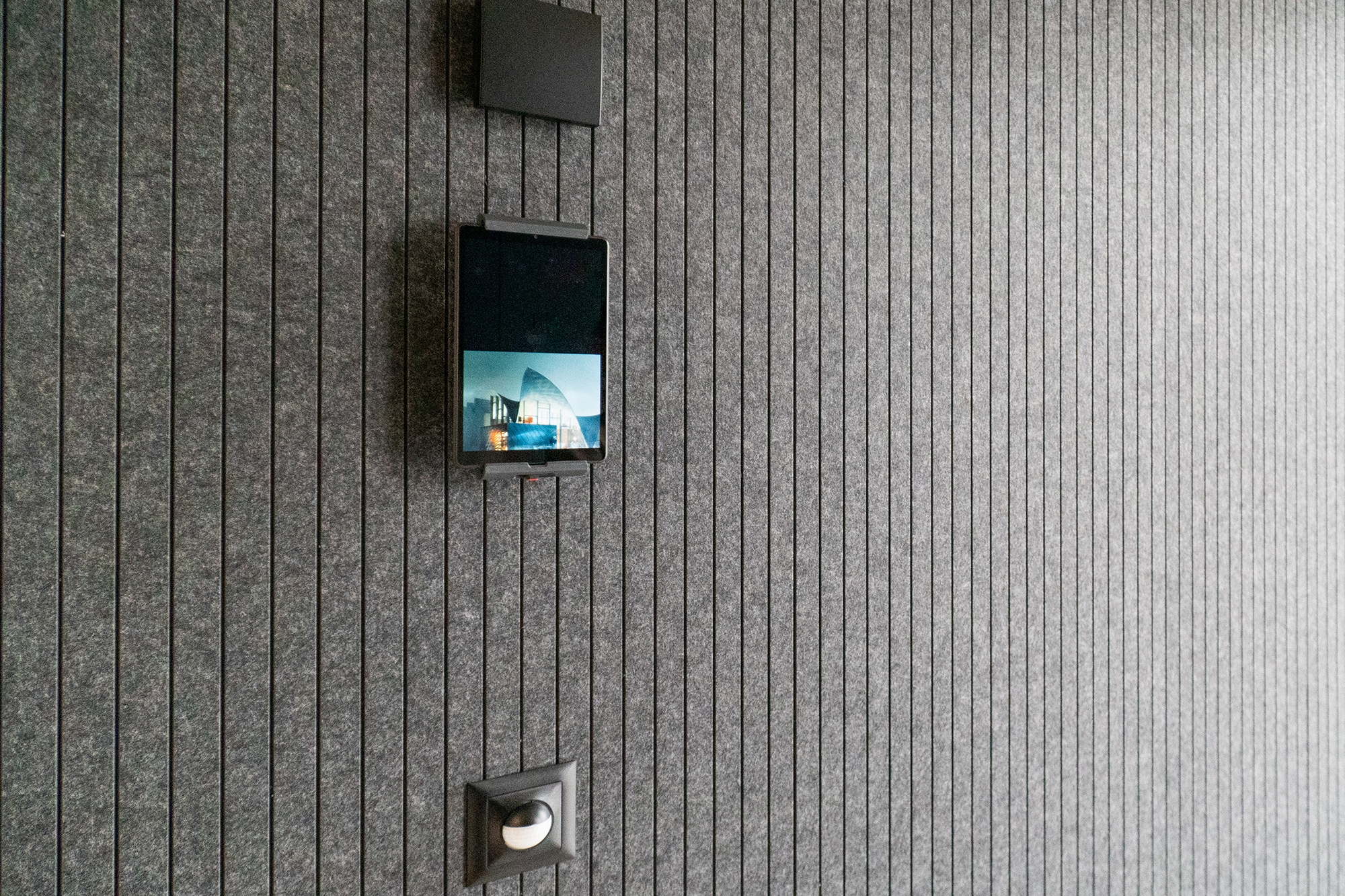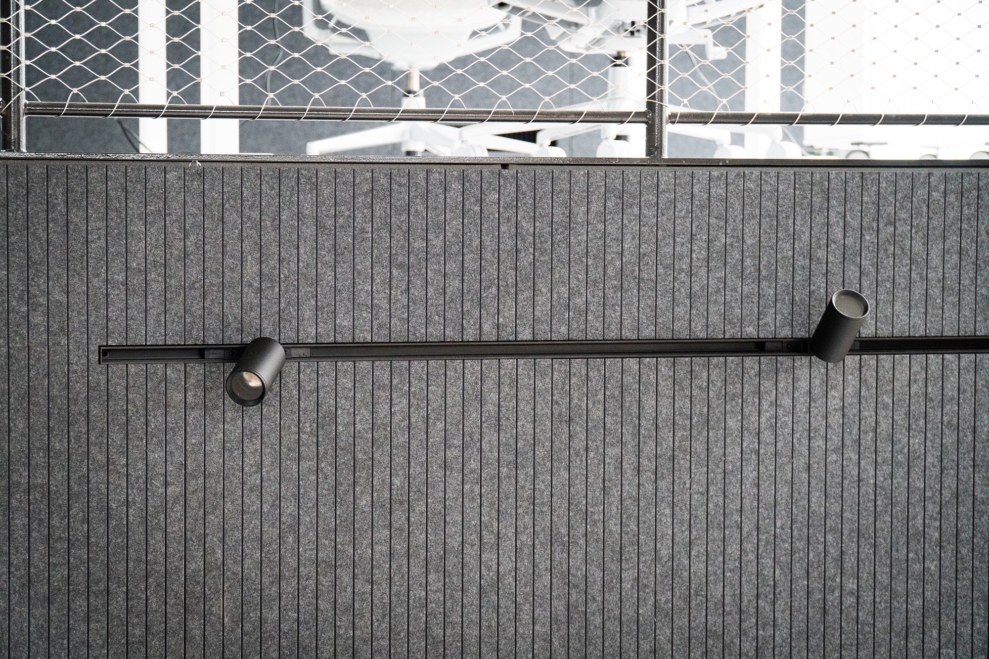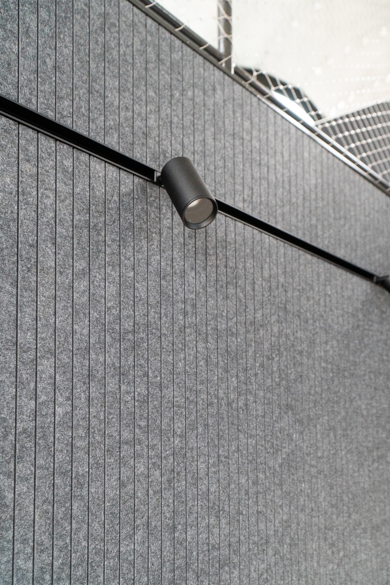 Die Akustikpanels Vertigo, die wir aus wiederverwerteten PET-Flaschen herstellen, integrieren sich nahtlos in die Designumgebung. Das adaptive Material ermöglicht Präzise Aussparungen für Bestandteile der Gebäudetechnik und kann auch als Verschalung von grösseren technischen Bestandteilen dienen.