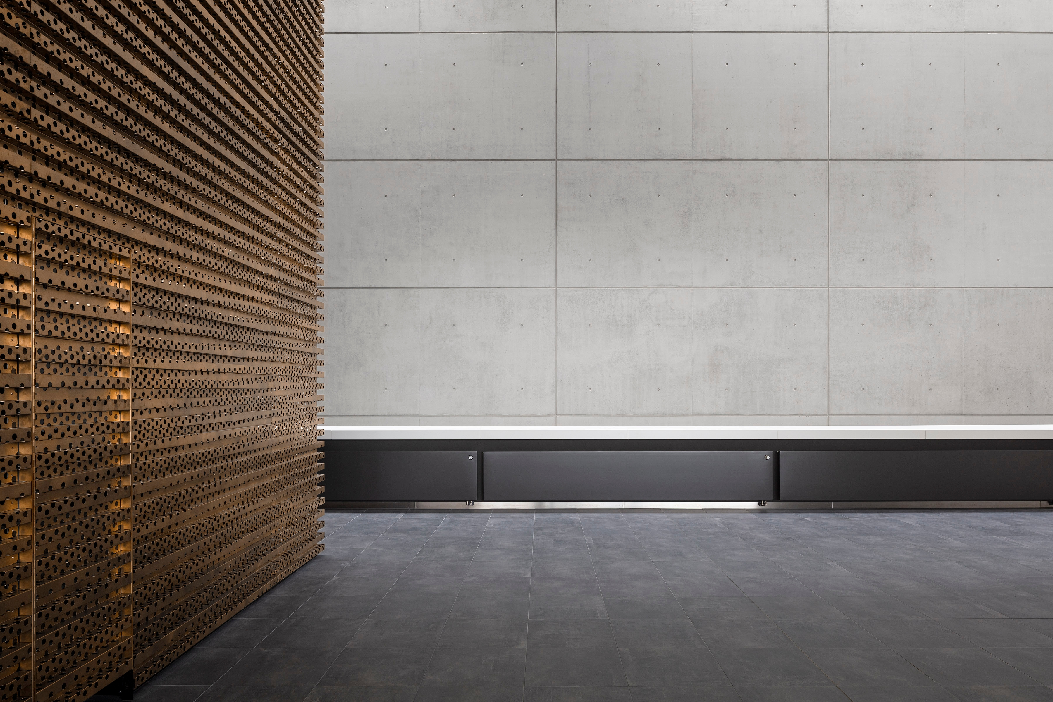Für die Gestaltung der Innenräume und der zahlreichen Service-Points kam insbesondere Eiche aus nachhaltiger Holzproduktion als natürliches, warmes Material zum Einsatz, um einen angenehmen Kontrast zum Sichtbeton, Glas und Mineralwerkstoff zu erzeugen. Auch die Möbel in den gastronomischen Flächen stechen mit ihrer gedeckten, eleganten Farbigkeit hervor.