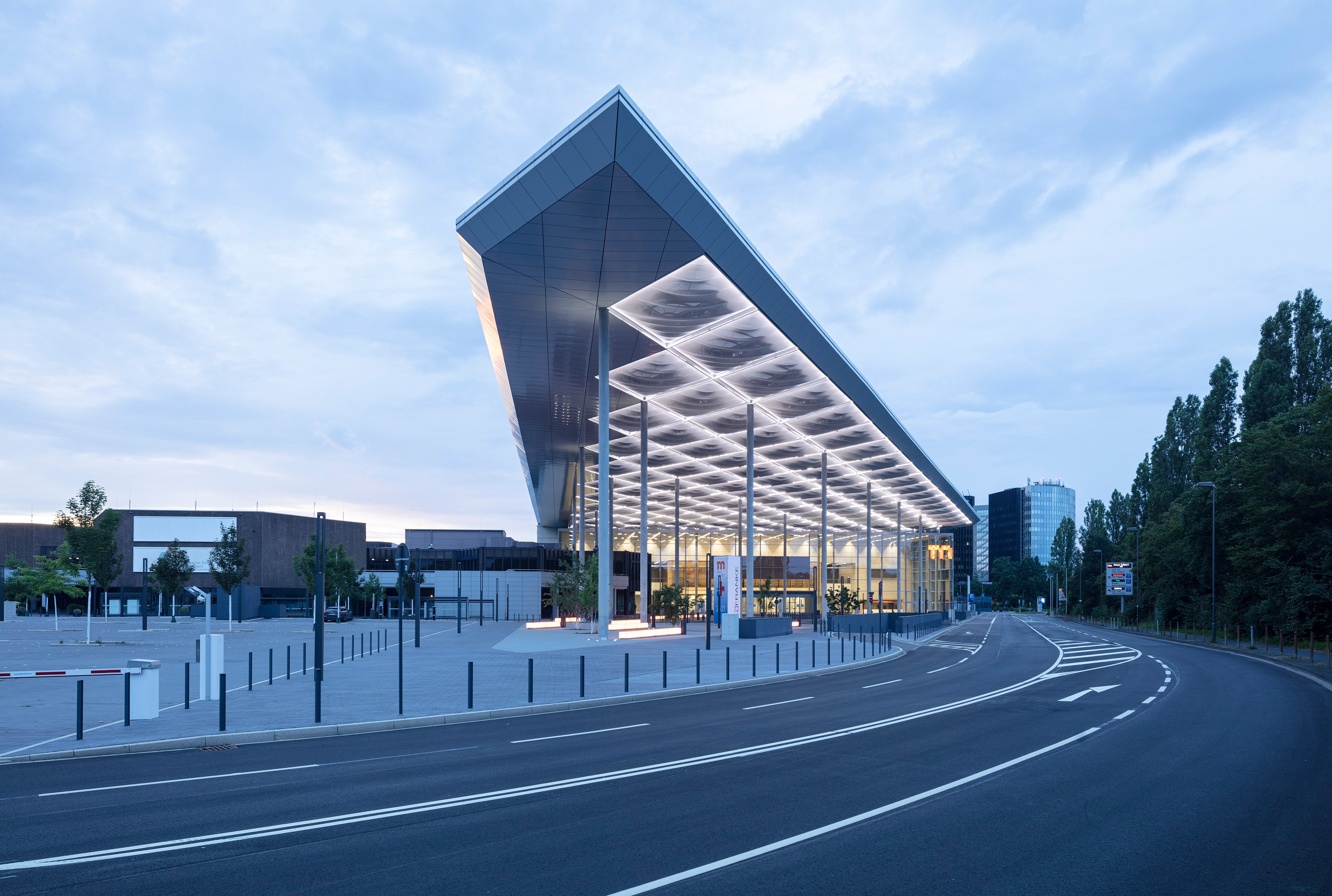 Mit einem rund 7.800m² großen, transluzenten Vordach verleihen sop architekten der Messe nicht nur eine bereits vom Wasser aus, weithin sichtbare Adresse. Vom repräsentativen Messevorplatz mit Taxivorfahrten, Bushaltestellen, Fahrradstellplätzen, Ladestationen für Elektromobilität und tageslichtdurchfluteten Zugängen zu einer großzügigen Tiefgarage, über den transparenten Südeingang mit flexiblen Konferenzflächen bis hin zur multifunktionalen Messehalle 1 vereint das 20 Meter hohe Dach alle Funktionen unter sich.