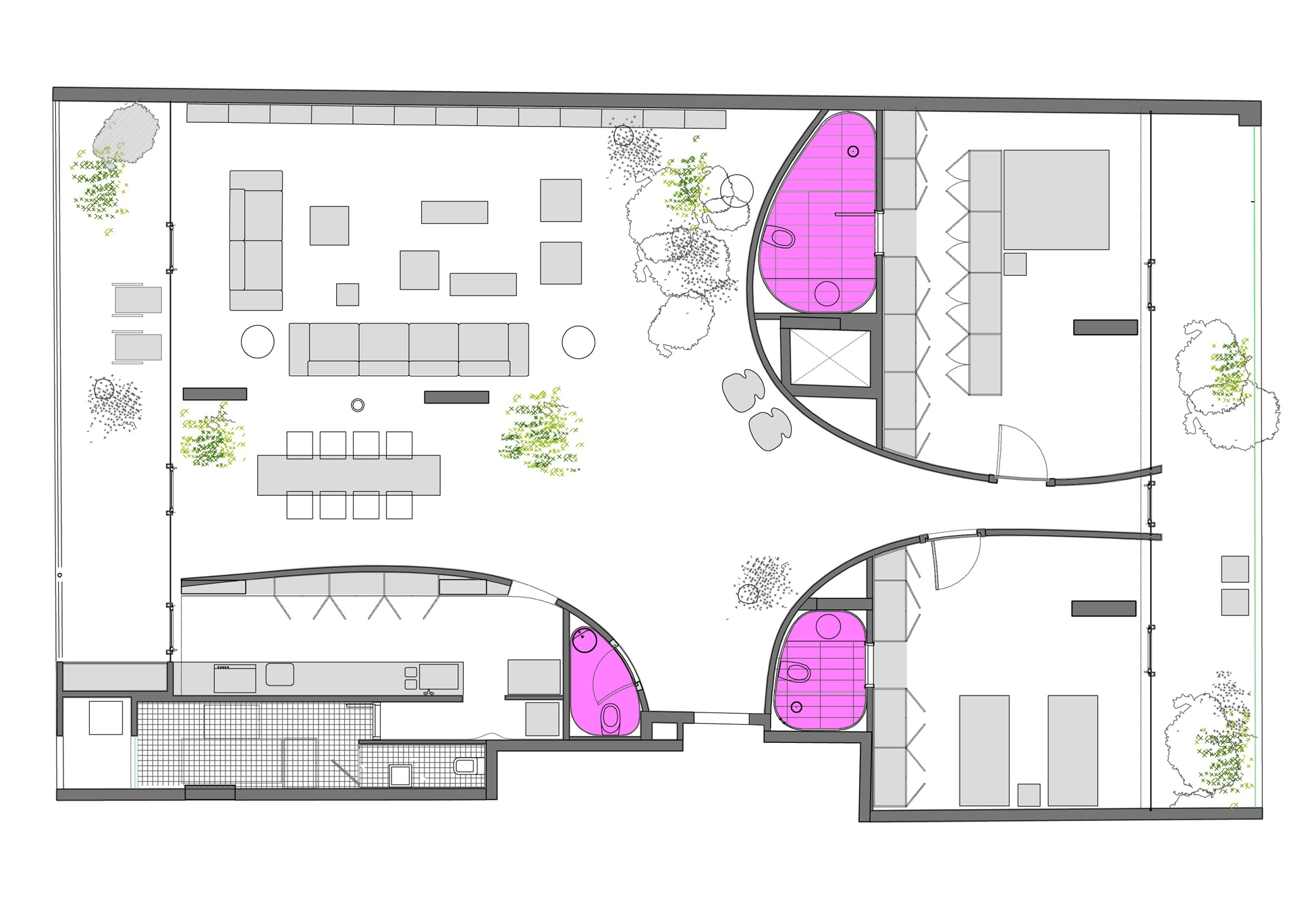 The proposed plan relies on three curved walls to define the spaces generating a re-orientation of the apartment towards the views with an expanded and open living, dining and entrance.